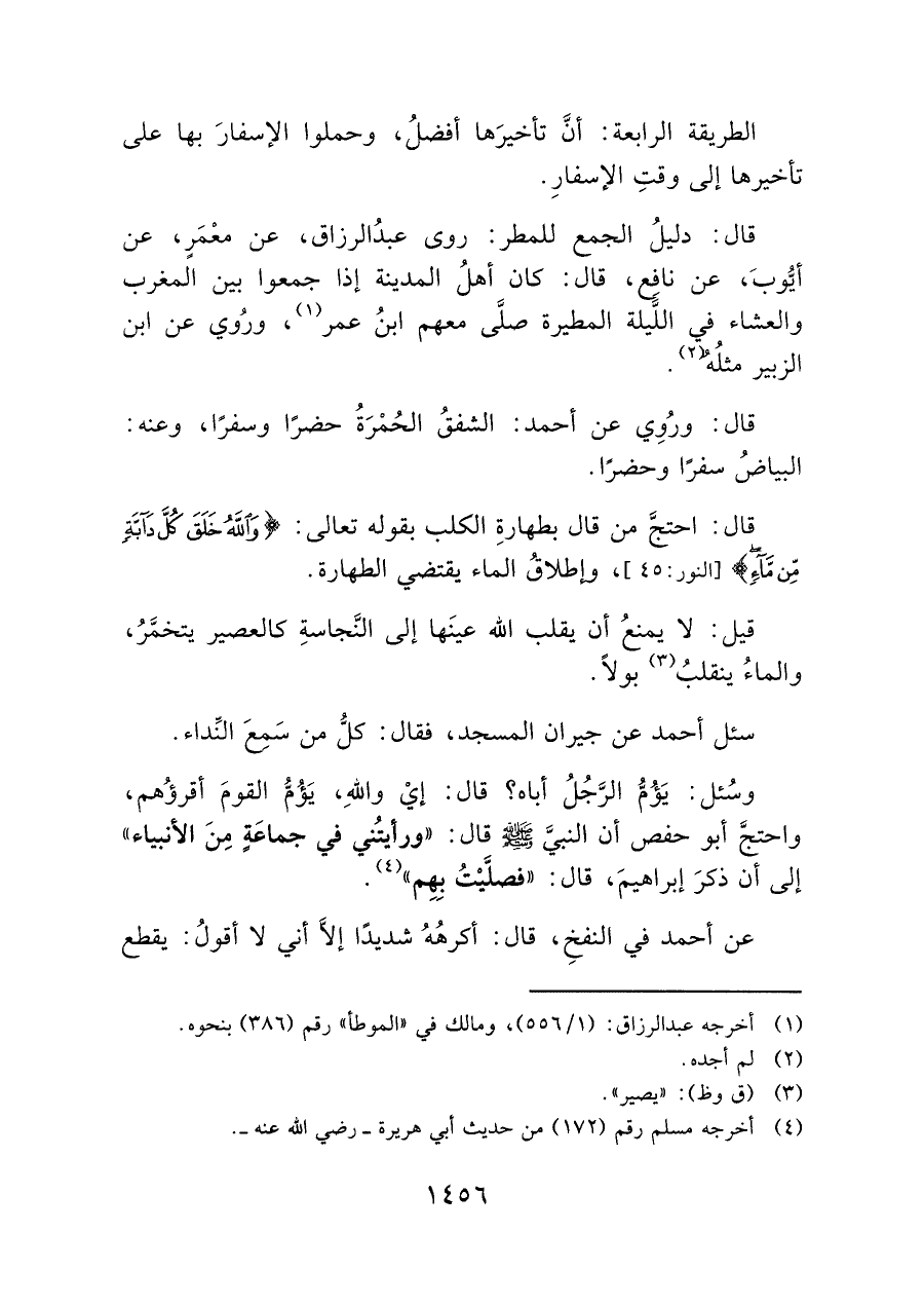 قال: ورُوِىِ عن أحمد: الشفقُ الحُمرَةُ حضرًا وسفرًا، وعنه: البياضُ سفرًا وحضرًا.