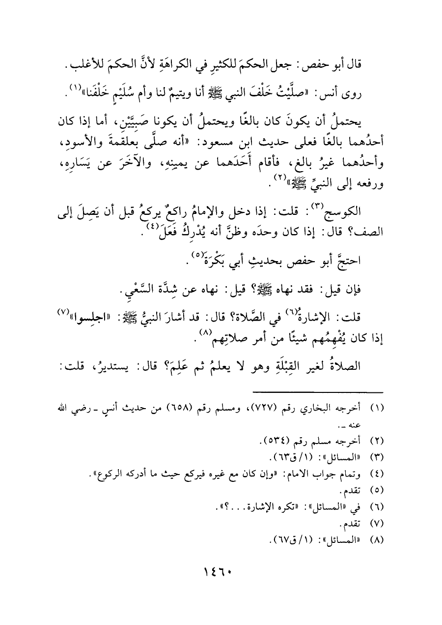قلت: الإشارةُ (¬٦) في الصَّلاة؟ قال: قد أشارَ النبيُّ - صلى الله عليه وسلم -: "اجلِسوا" (¬٧) إذا كان يُفهِمهم شيئًا من أمر صلاتِهم (¬٨).