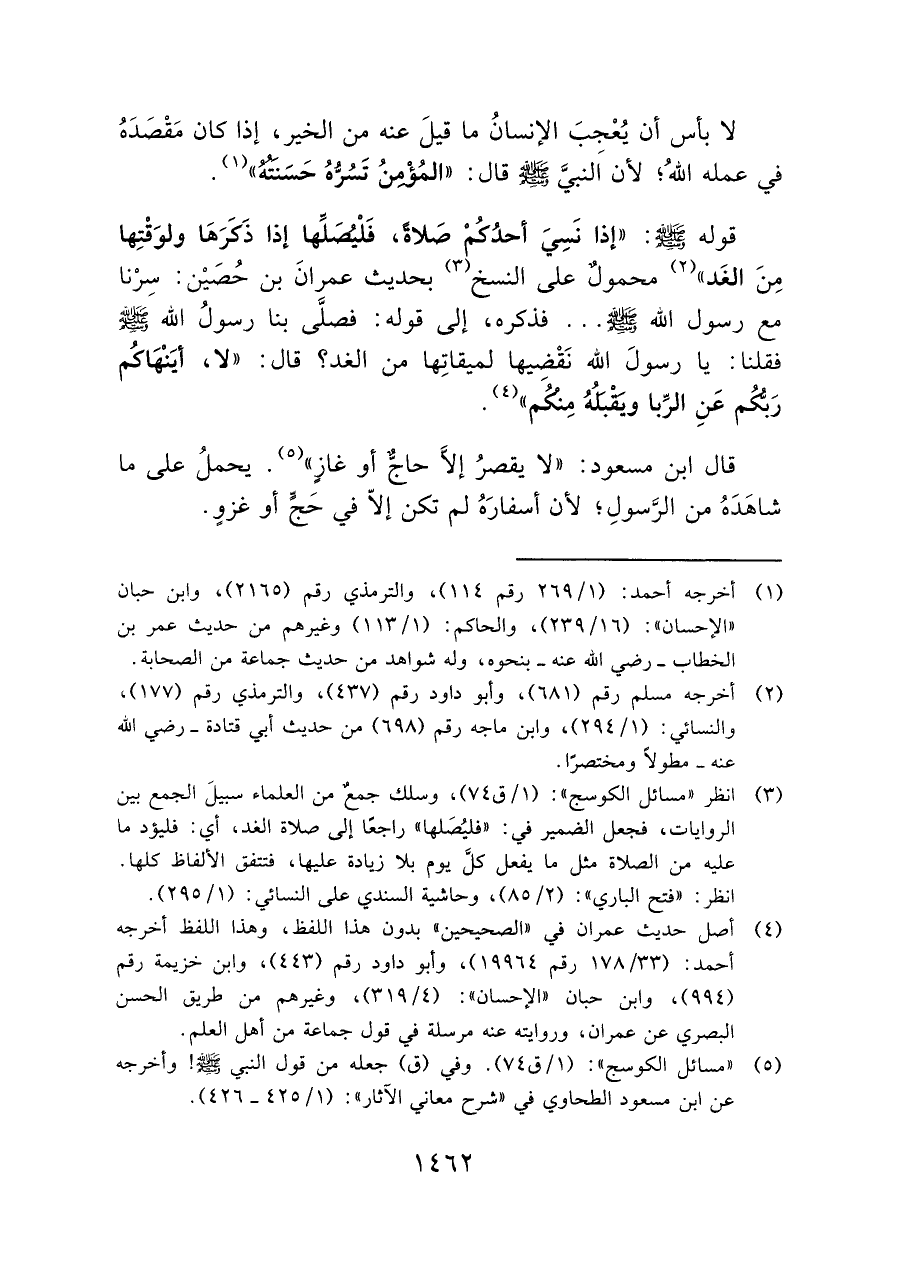 (¬٤) أصل حديث عمران في "الصحيحين" بدون هذا اللفظ، وهذا اللفظ أخرجه أحمد: (٣٣/ ١٧٨ رقم ١٩٩٦٤)، وأبو داود رقم (٤٤٣)، وابن خزيمة. رقم (٩٩٤)، وابن حبان "الإحسان": (٤/ ٣١٩)، وغيرهم من طريق الحسن البصري عن عمران، ورواية عنه مرسلة في قول جماعة من أهل العلم.