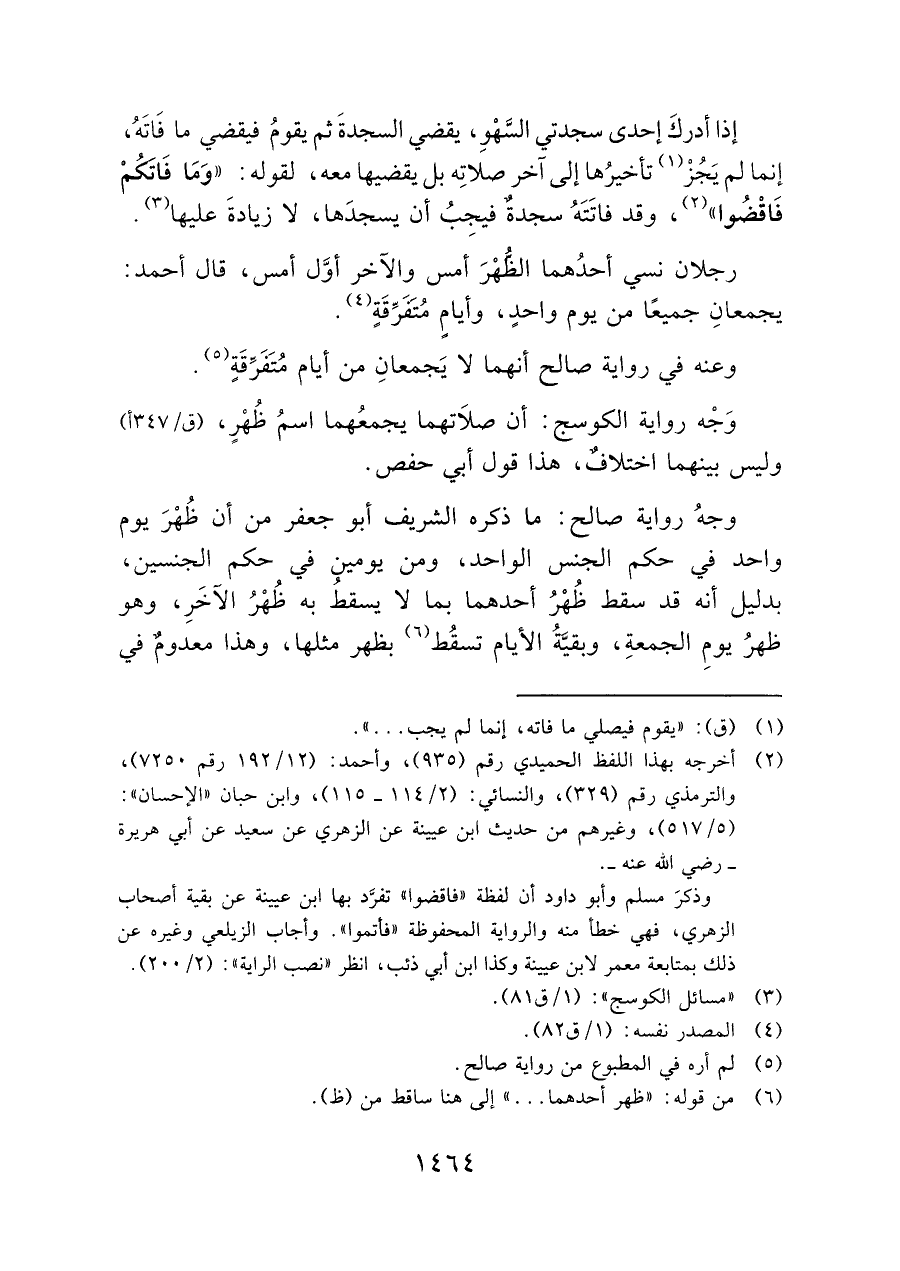 رجلان نسي أحدُهما الظُّهْرَ أمس والآخر أوَّل أمس، قال أحمد: يجمعان جميعًا من يوم. واحدٍ، وأيامٍ متفرِّقَةٍ (¬٤).