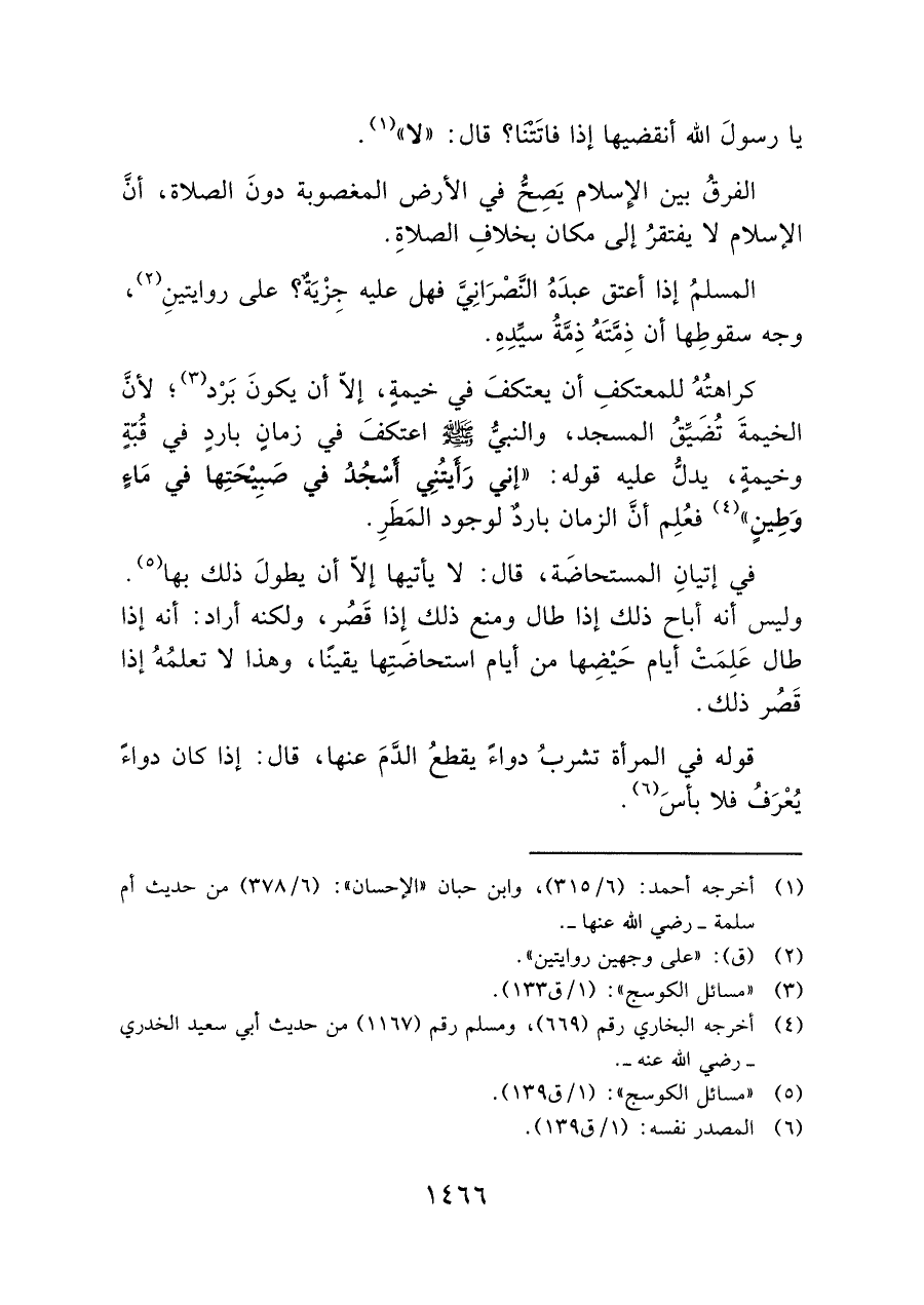 كراهتهُ للمعتكفِ أن يعتكفَ في خيمةٍ، إلا أن يكونَ بَرْد (¬٣)؛ لأنَّ الخيمةَ تُضَيِّق المسجد، والنبيُّ - صلى الله عليه وسلم - اعتكفَ في زمان باردٍ في قُبّةٍ وخيمة، يدلُّ عليه قوله: "إنى رَأيتُنِي أسْجدُ فْي صَبيْحَتِها في ماءٍ وطينٍ" (¬٤) " فعُلِم أن الزمان بارد لوجود المطَرِ.