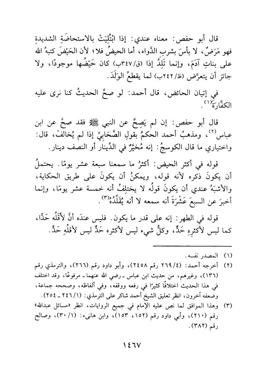 قال أبو حفص: معناه عندي: إذا ابْتُلِيَتْ بالاستحاضَةِ الشديدةِ فهو مَرَضٌ، لا بأسَ بشرب الدَّواء، أما الحيض فلا، لأن الحَيض كتبهُ الله على بناتِ آدَمَ، وإنما تَلِدُ إذا (ق/٣٤٧ ب)، كان حَيْضُها موجودًا، ولا جائز أن يتعرَّض (ظ/٢٤٢ ب) لما يقطع الوَلَدَ.