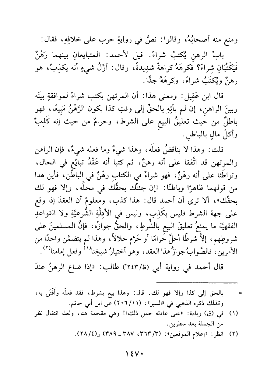 = بالحق إلى كذا وإلا فهو لك. قال: وهذا بيع بشرط، فقد فعلَه وأَفتَى به، وكذلك ذكره الذهبي في "السير": (١١/ ٢٠٦) عن ابن أبي حاتم.