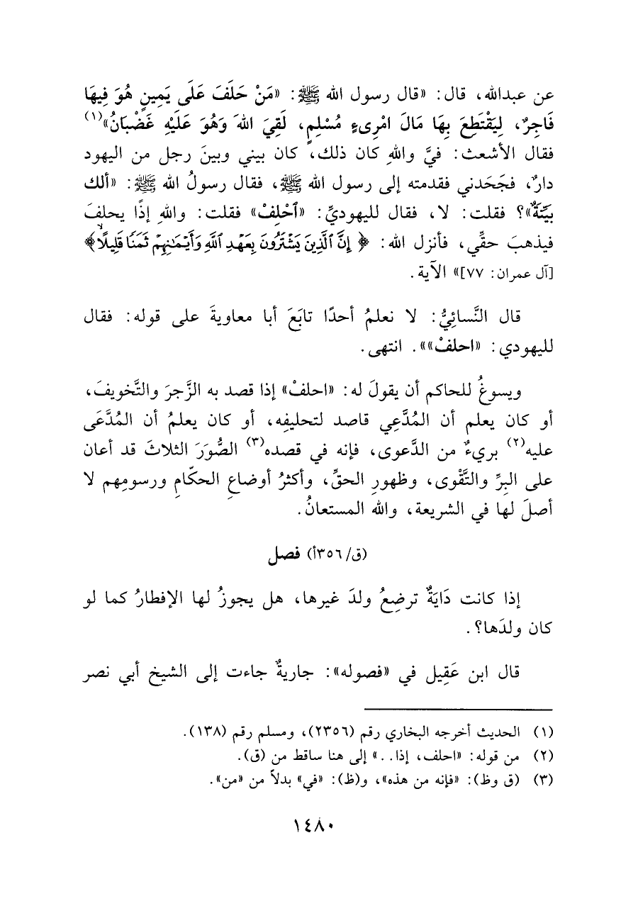 عن عبد الله، قال: "قال رسول الله - صلى الله عليه وسلم -: "مَنْ حَلَفَ عَلَى يمين هُوَ فِيهَا فَاجِرٌ، لِيقتَطعَ بِهَا مَال امْرِئٍ مسْلِمٍ، لَقِيَ اللهَ وَهُوَ عَلَيْهِ غَضْبان" (¬١) فقال الأشعث: فيَّ واللهِ كان ذلك، كان بينى وبينَ رجل من اليهود دارٌ فجَحَدني فقدمته إلى رسول الله - صلى الله عليه وسلم -، فقال رسولُ الله - صلى الله عليه وسلم -: "ألك بينة؟ فقلت: لا، فقال لليهوديِّ: "احْلِفْ" فقلت: واللهِ إذا يحلفَ فيذهبَ حقِّي، فأنزل: الله: {إِنَّ الَّذِينَ يَشْتَرُونَ بِعَهْدِ اللَّهِ وَأَيْمَانِهِمْ ثَمَنًا قَلِيلًا} [آل عمران: ٧٧] " الآية.
