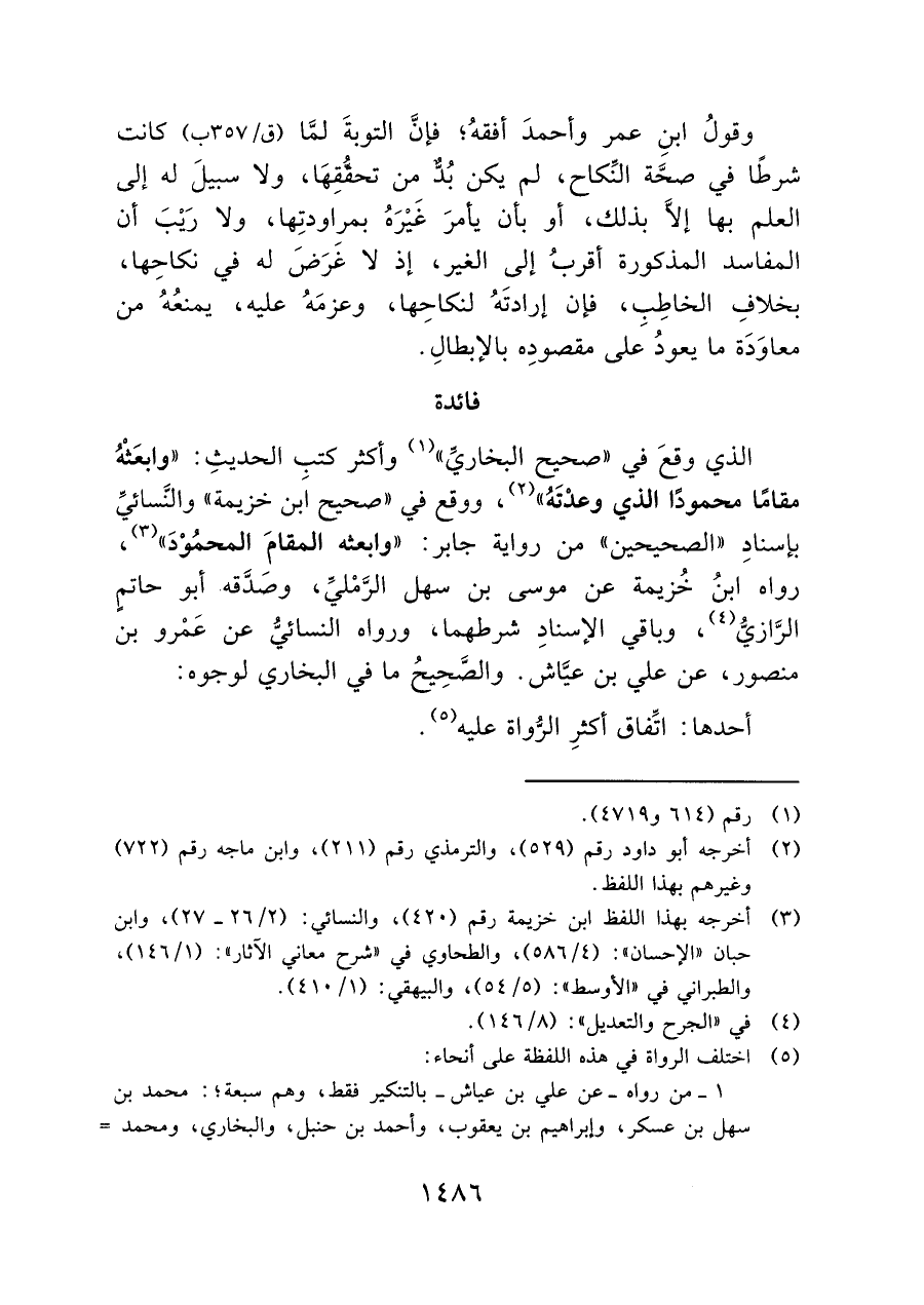 الذي وقعَ في "صحيح البخاريِّ" (¬١) وأكثر كتبِ الحديثِ: "وابعَثْهُ مقامًا محمودًا الذي وعدْتَه" (¬٢)، ووقع في "صحيح ابن خزيمة" والنَّسائيِّ بإسنادِ "الصحيحين": من رواية جابر: "وابعثه المقامَ المحمُوْدَ" (¬٣)، رواه ابنُ خُزيمة عن موسى بن سهل الرَّمْليِّ، وصَدَّقه أبو حاتمٍ الرَّازيُّ (¬٤)، وباقي الإسنادِ شرطهما، ورواه النسائي عن عَمْرو بن منصور، عن علي بن عيَّاش. والصَّحِيحُ ما في البخاري لوجوه: