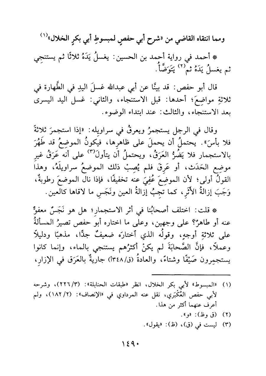* قلت: اختلف أصحابُنا في أثر الاستجمارِ؛ هل هو نَجَسٌ معفوٌّ عنه أو طاهرٌ؟ على وجهين، وعلى ما اختاره أبو حفص تصيرُ المسألةُ على ثلاثةِ أوجهٍ، وقولُه الذي اختارَه ضعيفٌ جدًّا، مذهبًا ودليلًا وعملًا، فإنَّ الصَّحابَةَ لم يكنْ أكثرُهم يستنجي بالماء، وإنما كانوا يستجمِرون صَيْفًا وشتاءً، والعادةُ (ق/ ٣٤٨ أ) جاريةٌ بالعَرَق في الإزارِ،