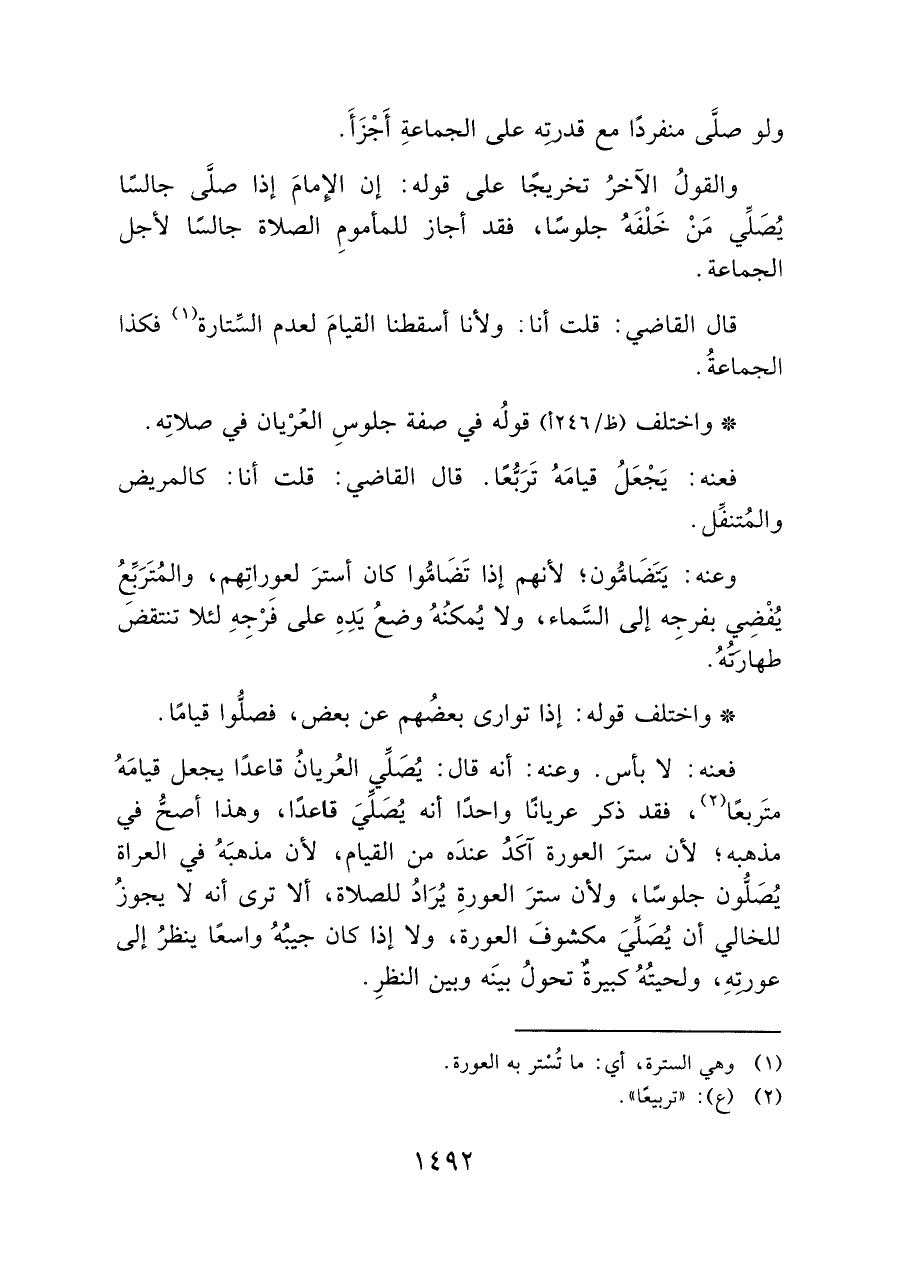 * واختلف (ظ/ ٢٤٦ أ)، قولُه في صفة جلوس العَرْيان في صلاتِه.