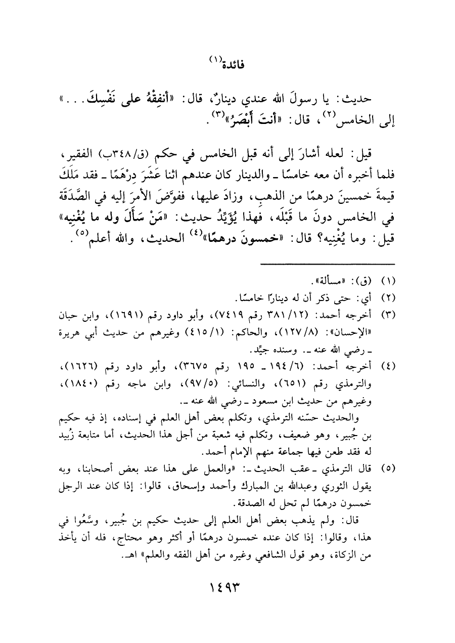 (¬٥) قال الترمذي -عقب الحديث-: "والعمل على هذا عند بعض أصحابنا، وبه يقول الثوري وعبد الله بن المبارك وأحمد وإسحاق، قالوا: إذا كان عند الرجل خمسون درهمًا لم تحل له الصدقة.