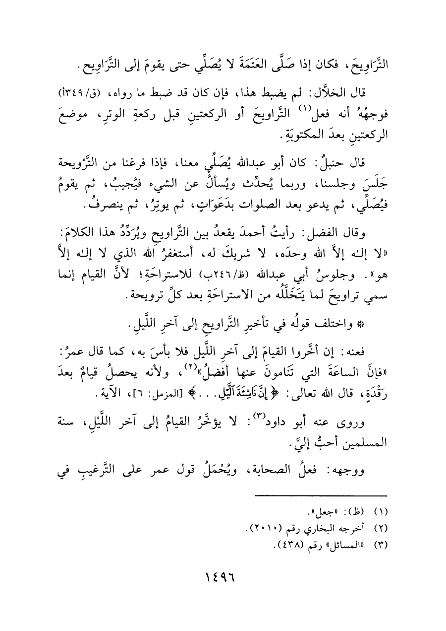 وقال الفضل: رأيتُ أحمدَ يقعدُ بين التَّراويحِ ويُرَدِّدُ هذا الكلامَ: "لا إله إلَّا الله وحدَه، لا شريكَ له، أستغفرُ الله الذي لا إله إلَّا هو". وجلوسُ أبي عبد الله (ظ/ ٢٤٦ ب)، للاستراحَةِ؛ لأن القيام إنما سمي تراويحَ لما يَخَلَّلُه من الاستراحَةِ بعد كلِّ ترويحة.