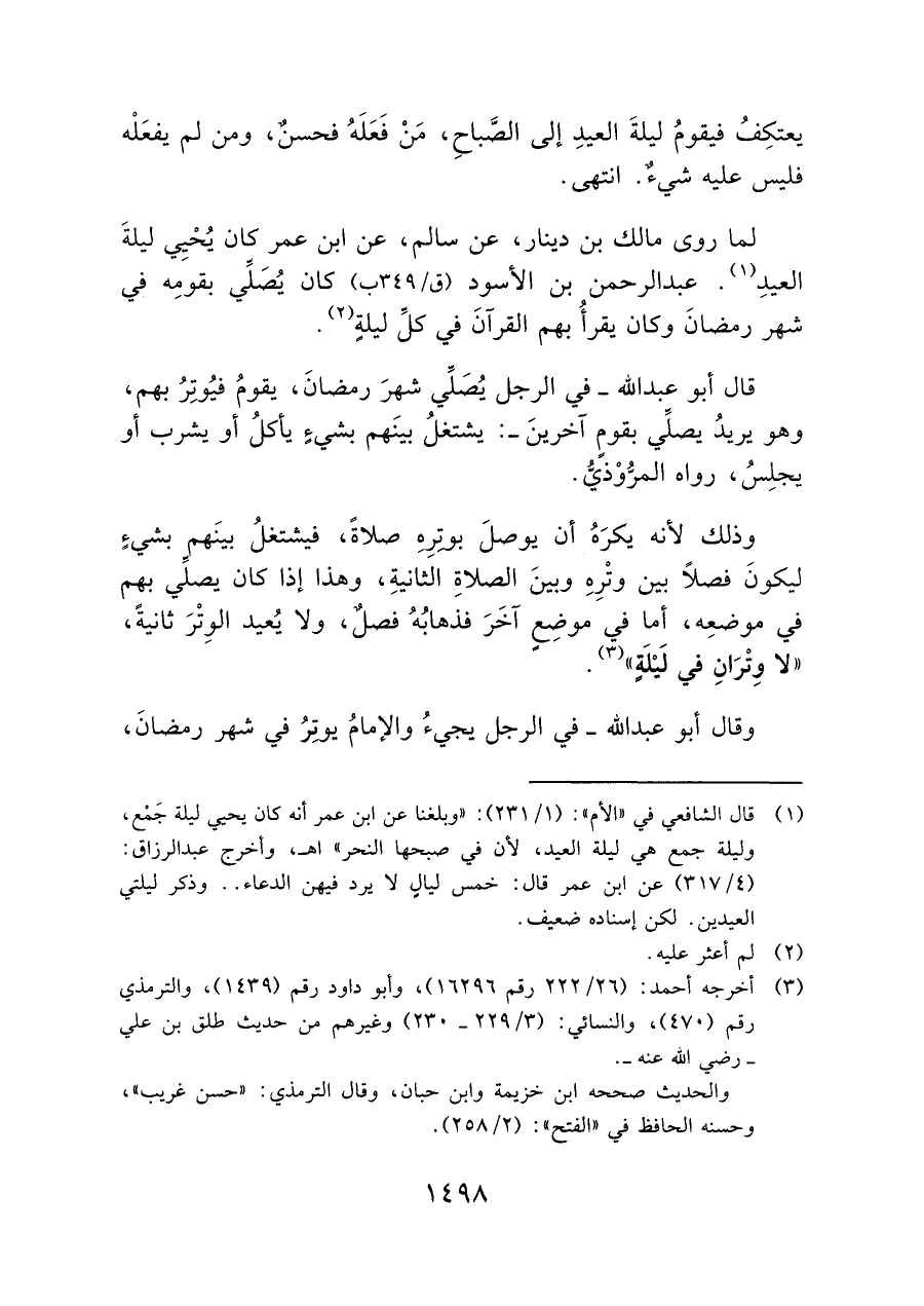 لما روى مالك بن دينار، عن سالم، عن ابنْ عمر كان يُحْيِي ليلةَ العيدِ (¬١). عبد الرحمن بن الأسود (ق/ ٣٤٩ ب)، كان يُصَلِّي بقومِه في شهر رمضان وكان يقرأُ بهم القرآن في كلِّ ليلةٍ (¬٢):