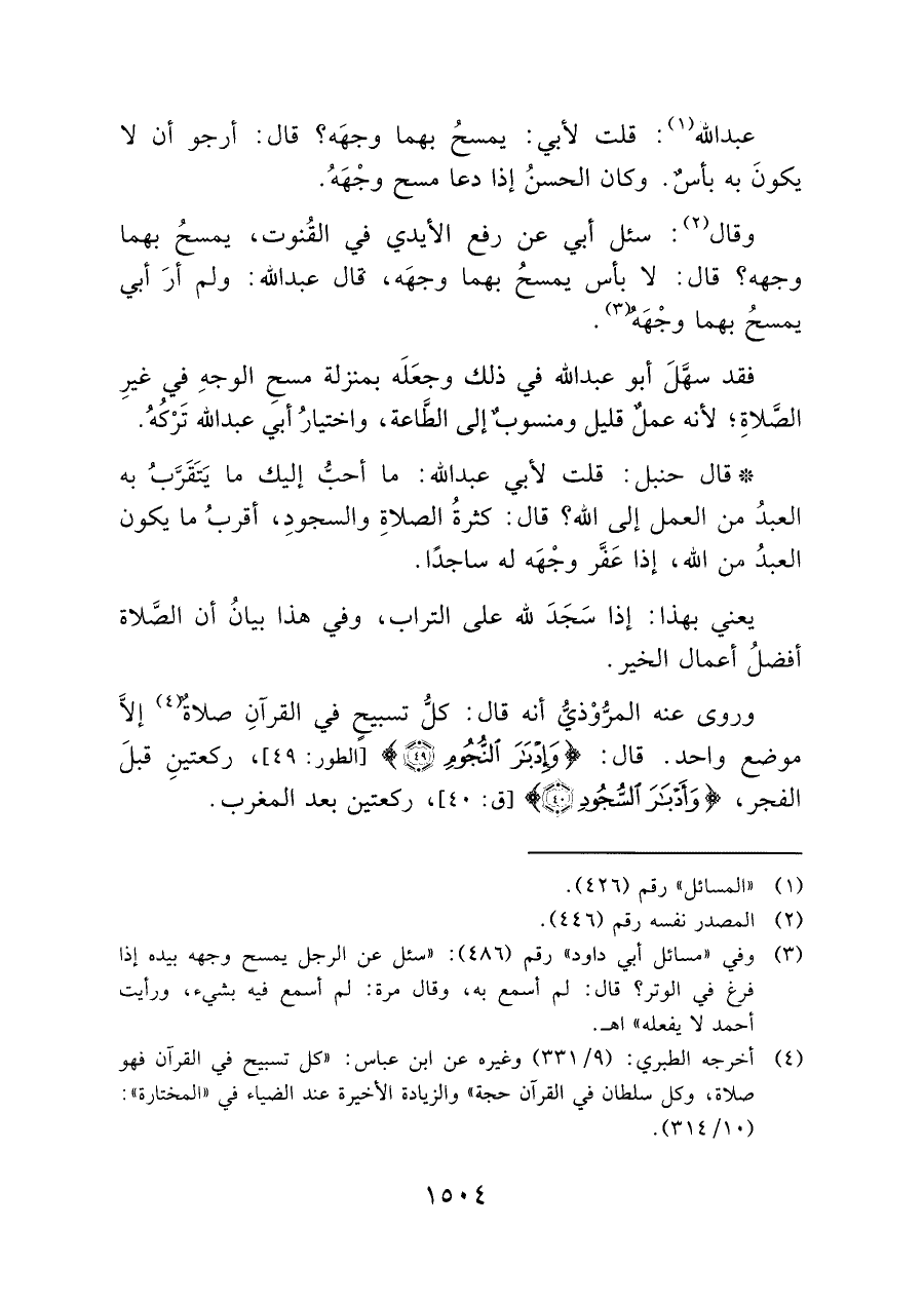 (¬٣) وفي "مسائل أبي داود" رقم (٤٨٦): "سئل عن الرجل يمسح وجهه بيده إذا فرغ في الوتر؟ قال: لم أسمع به، وقال مرة: لم أسمع فيه بشيء، ورأيت أحمد لا يفعله" أهـ.