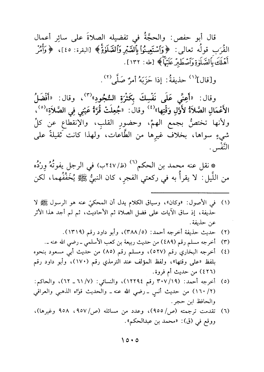 قال أبو حفص: والحجَّةُ في تفضيله الصلاةَ على سائِر أعمال القرَب قولُه تعالى: {وَاسْتَعِينُوا بِالصَّبْرِ وَالصَّلَاةِ} [البقرة: ٤٥]، {وَأْمُرْ أَهْلَكَ بِالصَّلَاةِ وَاصْطَبِرْ عَلَيْهَا} [طه: ١٣٢].