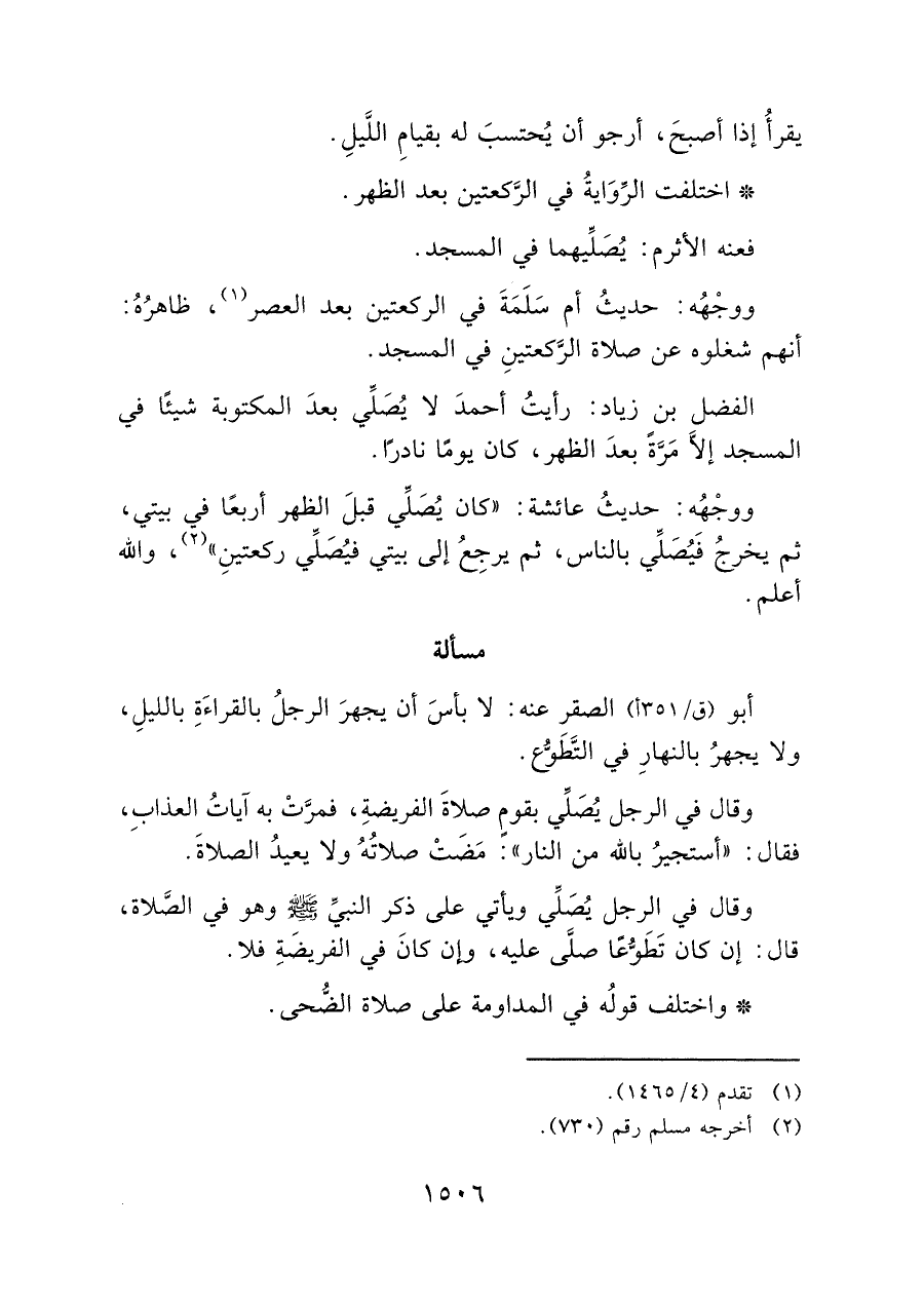 الفضل بن زياد: رأيتُ أحمدَ لا يُصَلِّي بعدَ المكتوبة شيئًا في المسجد إلَّا مَرَّةً بعدَ الظهر، كان يومًا نادرًا.
