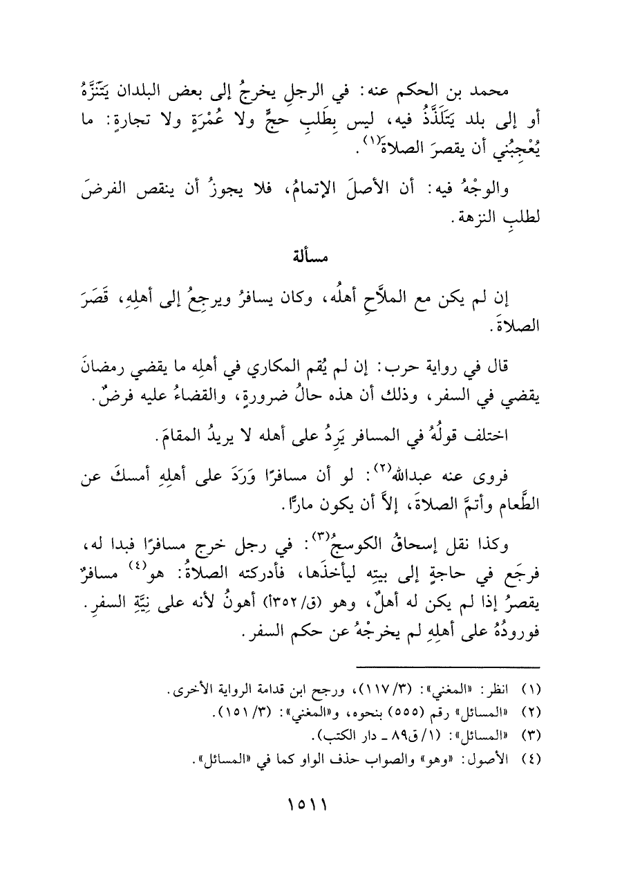 وكذا نقل إسحاقُ الكوسجُ (¬٣): في رجل خرج مسافرًا فبدا له، فرجَع في حاجةٍ إلى بيتِه ليأخذَها، فأدركته الصلاةُ: هو (¬٤) مسافرٌ يقصرُ إذا لم يكن له أهلٌ، وهو (ق/ ٣٥٢ أ) أهونُ لأنه على نِيَّةِ السفرِ. فورودُهُ على أهلِهِ لم يخرجْهُ عن حكم السفر.