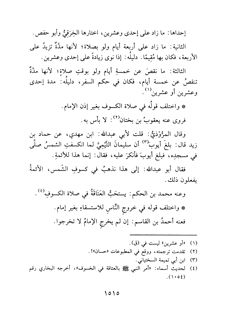 وقال المرُّوْذيُّ: قلت لأبي عبد الله: ابن مهدي، عن حماد بن زيد قال: بلغَ أيوبَ (¬٣) أن سليمانَ التَّيْمِيَّ لما انكسفتِ الشمسُ صلَّى في مسجدِه، فبلغ أيوبَ فأنكرَ عليه، فقال: إنما هذا للأئمةِ.