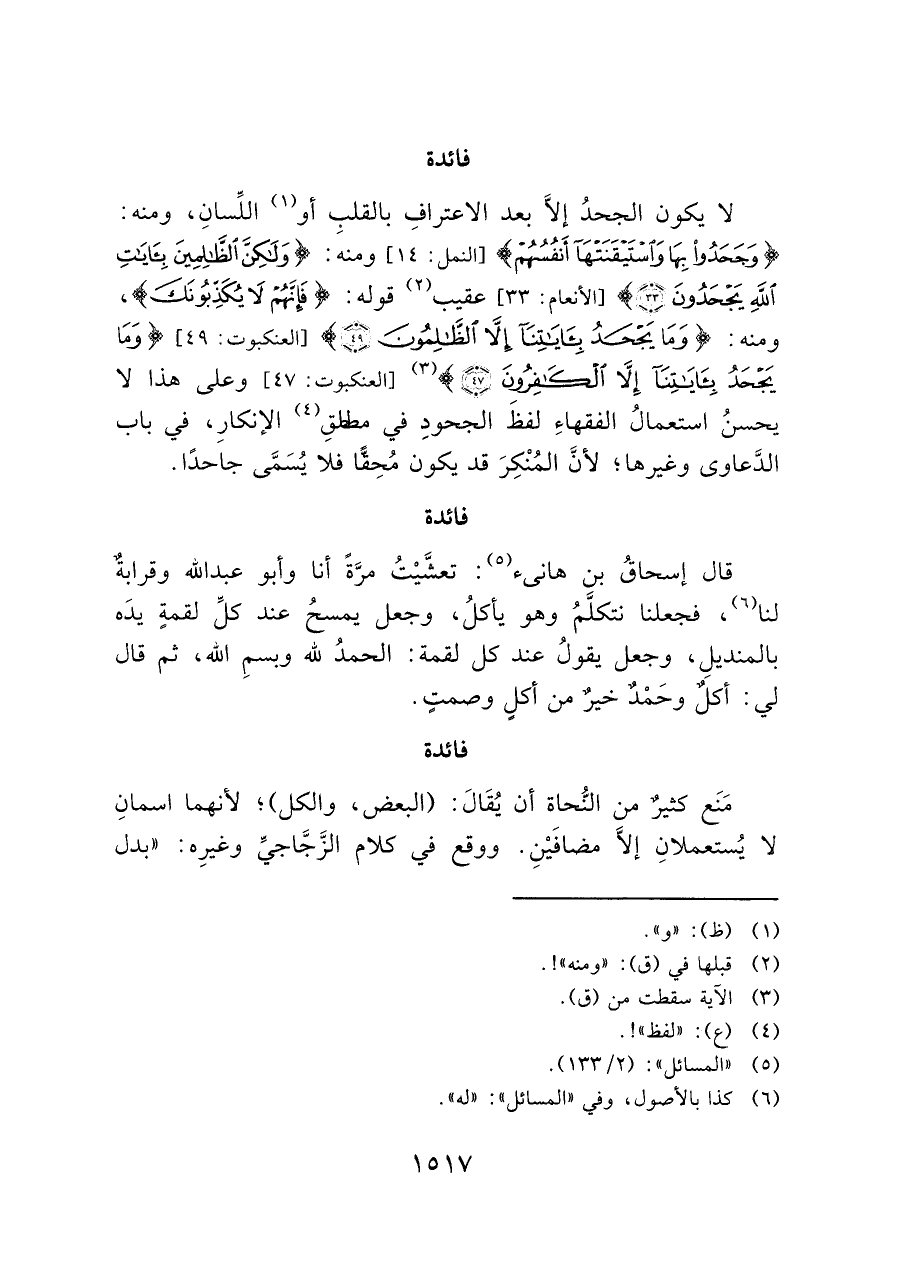 لا يكون الجحدُ إلَّا بعد الاعترافِ بالقلبِ أو (¬١) اللِّسانِ، ومنه: {وَجَحَدُوا بِهَا وَاسْتَيْقَنَتْهَا أَنْفُسُهُمْ} [النمل: ١٤] ومنه: {وَلَكِنَّ الظَّالِمِينَ بِآيَاتِ اللَّهِ يَجْحَدُونَ (٣٣)} [الأنعام: ٣٣] عقيب (¬٢) قوله: {فَإِنَّهُمْ لَا يُكَذِّبُونَكَ}، ومنه: {وَمَا يَجْحَدُ بِآيَاتِنَا إِلَّا الظَّالِمُونَ (٤٩)} [العنكبوت: ٤٩] {وَمَا يَجْحَدُ بِآيَاتِنَا إِلَّا الْكَافِرُونَ (٤٧)} (¬٣) [العنكبوت: ٤٧] وعلى هذا لا يحسنُ استعمالُ الفقهاءِ لفظَ الجحودِ في مطلقِ (¬٤) الإنكارِ، في باب الدَّعاوى وغيرها؛ لأن المُنْكِرَ قد يكون مُحِقًّا فلا يُسَمَّى جاحدًا.