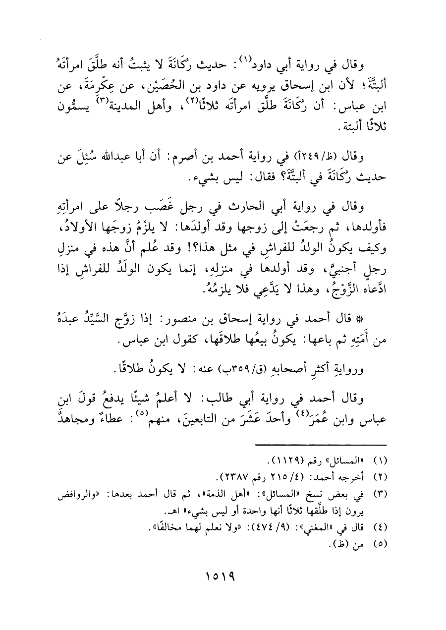 (¬٣) في بعض نسخ "المسائل": "أهل الذمة"، ثم قال أحمد بعدها: "والروافض يكون إذا طلَّقها ثلاثًا أنها واحدة أو ليس بشيء" اهـ.