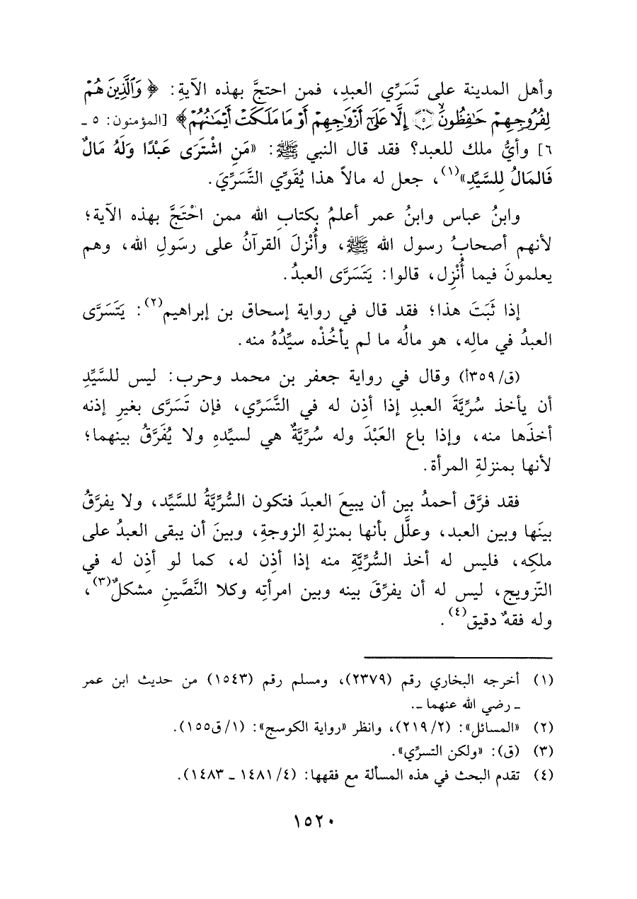 فقد فرَّق أحمدُ بين أن يبيعَ العبدَ فتكون السُّرِّيَّةُ للسَّيِّد، ولا يفرَّقُ بينَها وبين العيد، وعلَّل بأنها بمنزلةِ الزوجةِ، وبينَ أن يبقى العبدُ على ملكِه، فليس له أخذ السُّرِّيَّةِ منه إذا أذِن له، كما لو أذِن له في التّزويج، ليس له أن يفرِّقَ بينه وبين امرأتِه وكلا النَّصَّينِ مسكلٌ (¬٣)، وله فقهٌ دقيق (¬٤).