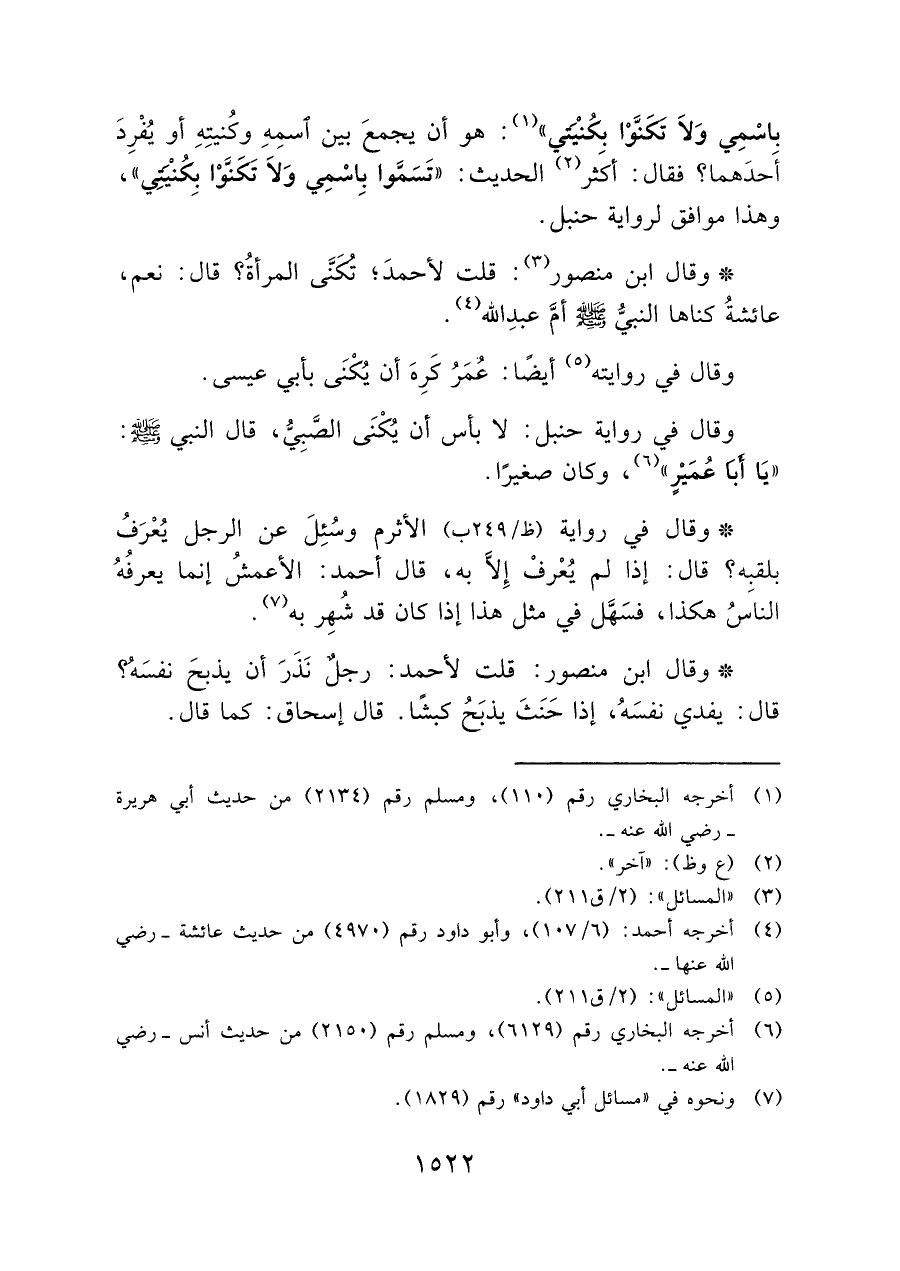 بِاسْمِي وَلا تَكَنَّوْا بكُنْيَتي" (¬١): هو أن يجمعَ بين اسمِهِ وكُنيتِهِ أو يُفْرِدَ أَحدَهما؟ فقال: أكَثر (¬٢) الحديث: "تَسَمَّوا باسْمِي وَلا تَكَنَّوْا بِكُنْيَتِي"، وهذا موافق لرواية حنبل.