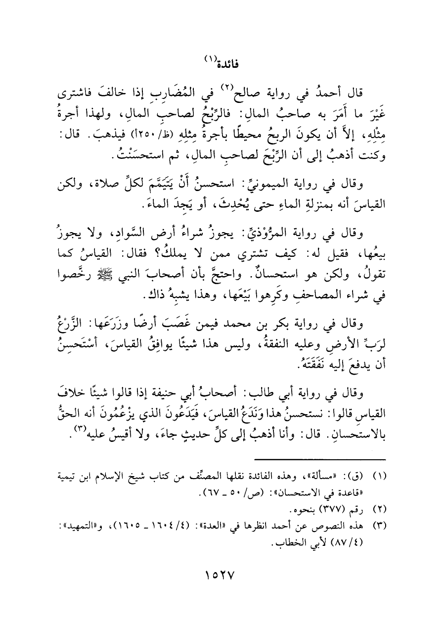 (¬١) (ق): "مسألة"، وهذه الفائدة نقلها المصنف من كتاب شيخ الإسلام ابن تيمية "قاعدة في الاستحسان": (ص/٥٠ - ٦٧).
