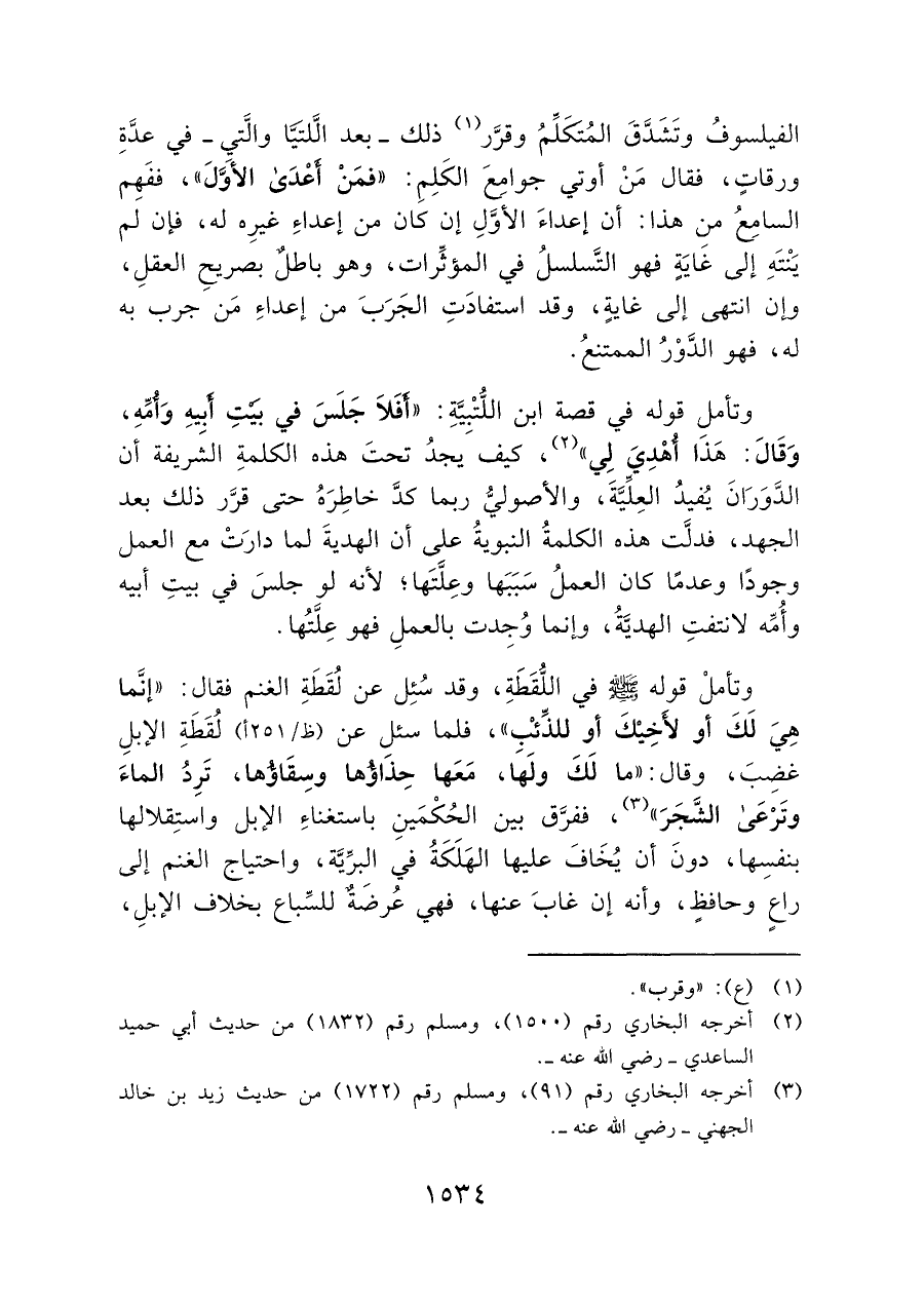 وتأمل قوله في قصة ابن اللُّتْبيَّةِ: "أفَلا جَلَسَ في بيتِ أبيهِ وأمَّهِ، وَقالَ: هَذا أُهْدِيَ لِي" (¬٢)، كيفَ يجدُ تحتَ هذه الكلمةِ الشريفة أن الدَّوَرَانَ يُفيدُ العِلِّيَّةَ، والأصوليُّ ربما كدَّ خاطِرَهُ حتى قرَّر ذلك بعد الجهد، فدلَّت هذه الكلمةُ النبوية على أن الهديةَ لما دارَت مع العمل وجودًا وعدمًا كان العمل سَبَبَها وعِلَّتها؛ لأنه لو جلسَ في بيتِ أبيه وأُمِّه لانتفتِ الهديَّةُ، وإنما وُجِدت بالعملِ فهو عِلَّتها.