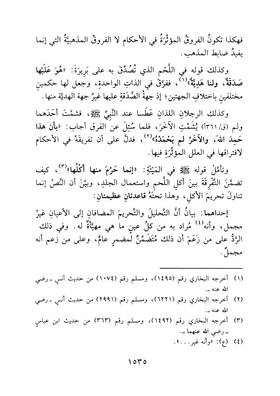 وتأمَّلْ قوله - صلى الله عليه وسلم - في المَيْتَةِ: "إنما حَرُمَ منها أَكْلها" (¬٣)، كيف تضمَنَ التَّفْرِقَةَ بينَ أكلِ اللَّحمِ واستعمال الجلدِ، وبيَّنَ أن النصَّ إنما تناولَ تحريمَ الأكلِ، وهدا تحتَهُ قاعدتانِ عظيمتانِ: