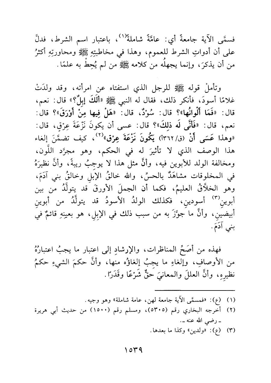 وتأملْ قوله - صلى الله عليه وسلم - للرجل الذي استفتاه عن امرأته، وقد ولدَتْ غلامًا أسودَ، فأنكر ذلك، فقال له النبي -صلى الله عليه وسلم- "ألَكَ إبِلٌ؟ " قال: نعم، قال: "فَما ألْوانُها"؟ قال: سُوْدٌ، قال: "هَلْ فِيها مِنْ أوْرقَ"؟ قال: نعم "قال: "فَأنَّى لهَ ذلِكَ"؟ قال: عسى أن يكونَ نَزْعَةَ عِرْقٍ، قال: "وهذا عَسَى أنْ (ق / ٣٦٢ أ)، يكُونَ نَزْعَةَ عِرْق" (¬٢)، كيف تضمَّنَ إلغاء هذا الوصف الذي لا تأثيرَ له في الحكم، وهو مجرَّد اللَّون، ومخالفة الولد للأبوين فيه، وأنَّ مثل هذا لا يوجب ريبةً، وأنَّ نظيرَهُ في المخلوقات مشاهدٌ بالحسَّ، والله خالقُ الإبَلِ وخالقُ بني آدَمَ، وهو الخلَّاقُ العليمُ، فكما أن الجملَ الأورقَ قد يتولَّدُ من بين أبوينِ (¬٣) أسودينِ، فكذلك الولدُ الأسود قد يتولَّدُ من أبوينِ أبيضينِ، وأنَّ ما جوَّزَ به من سبب ذلك في الإبل، هو بعينِهِ قائمٌ في بني آدَمَ.