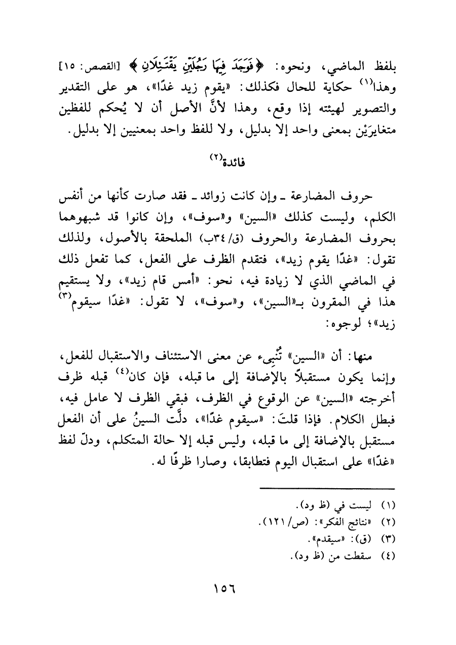 حروف المضارعة -وإن كانت زوائد- فقد صارت كأنها من أنفس الكلم، وليست كذلك "السين" و"سوف"، وإن كانوا قد شبهوهما بحروف المضارعة والحروف (ق/ ٣٤ ب) الملحقة بالأصول، ولذلك تقول: "غدا يقوم زيد"، فتقدم الظرف على الفعل، كما تفعل ذلك في الماضي الذي لا زيادة فيه، نحو: "أمس قام زيد"، ولا يستقيم هذا في المقرون بـ "السين"، و"سوف"، لا تقول: "غدًا سيقوم (¬٣) زيد"؛ لوجوه: