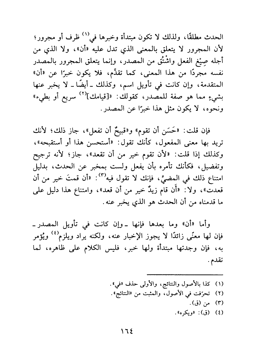 فإن قلت: "حَسَن أن تقوم" و"قبيحٌ أن تفعل"، جاز ذلك؛ لأنك تريد بها معنى المفعول، كأنك تقول: "أستحسن هذا أو أستقبحه"، وكذلك إذا قلت: "لأن تقوم خير من أن تقعد"، جاز؛ لأنه ترجيح وتفضيل، فكأنك تأمره بأن يفعل ولست بمخبر عن الحدث، بدليل امتناع ذلك في المضيِّ، فإنك لا تقول فيه (¬٣): "أن قمتَ خير من أن قعدت"، ولا: "أَن قام زيدٌ خير من أن قعد"، وامتناع هذا دليل على ما قدمناه من أن الحدث هو الذي يخبر عنه.