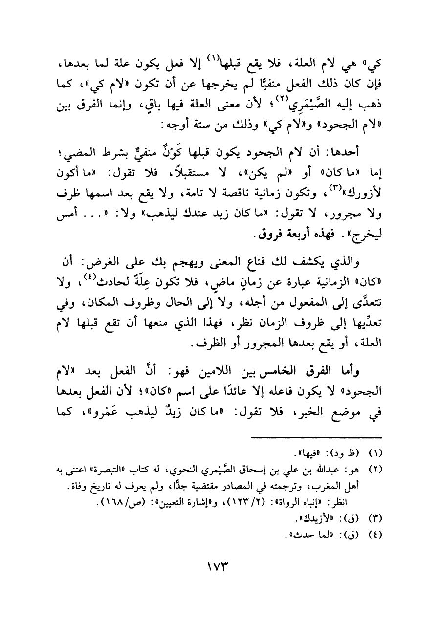 أحدها: أن لام الجحود يكون قبلها كَوْنٌ منفيٌّ بشرط المضي؛ إما "ما كان" أو "لم يكن"، لا مستقبلًا، فلا تقول: "ما أكون لأزورك" (¬٣)، وتكون زمانية ناقصة لا تامة، ولا يقع بعد اسمها ظرف ولا مجرور، لا تقول: "ما كان زيد عندك ليذهب" ولا: " ... أمس ليخرج". فهذه أربعة فروق.