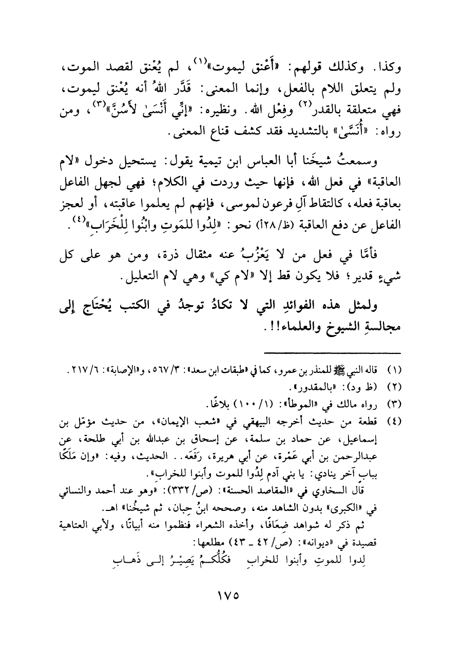 وكذا. وكذلك قولهم: "أَعْنق ليموت" (¬١)، لم يُعْنق لقصد الموت, ولم يتعلق اللام بالفعل، وإنما المعنى: قَدَّر اللهُ أنه يُعْنق ليموت, فهي متعلقة بالقدر (¬٢) وفِعْل الله. ونظيره: "إنِّي أَنْسَى لأَسُنَّ" (¬٣)، ومن رواه: "أُنَسَّى" بالتشديد فقد كشف قناع المعنى.