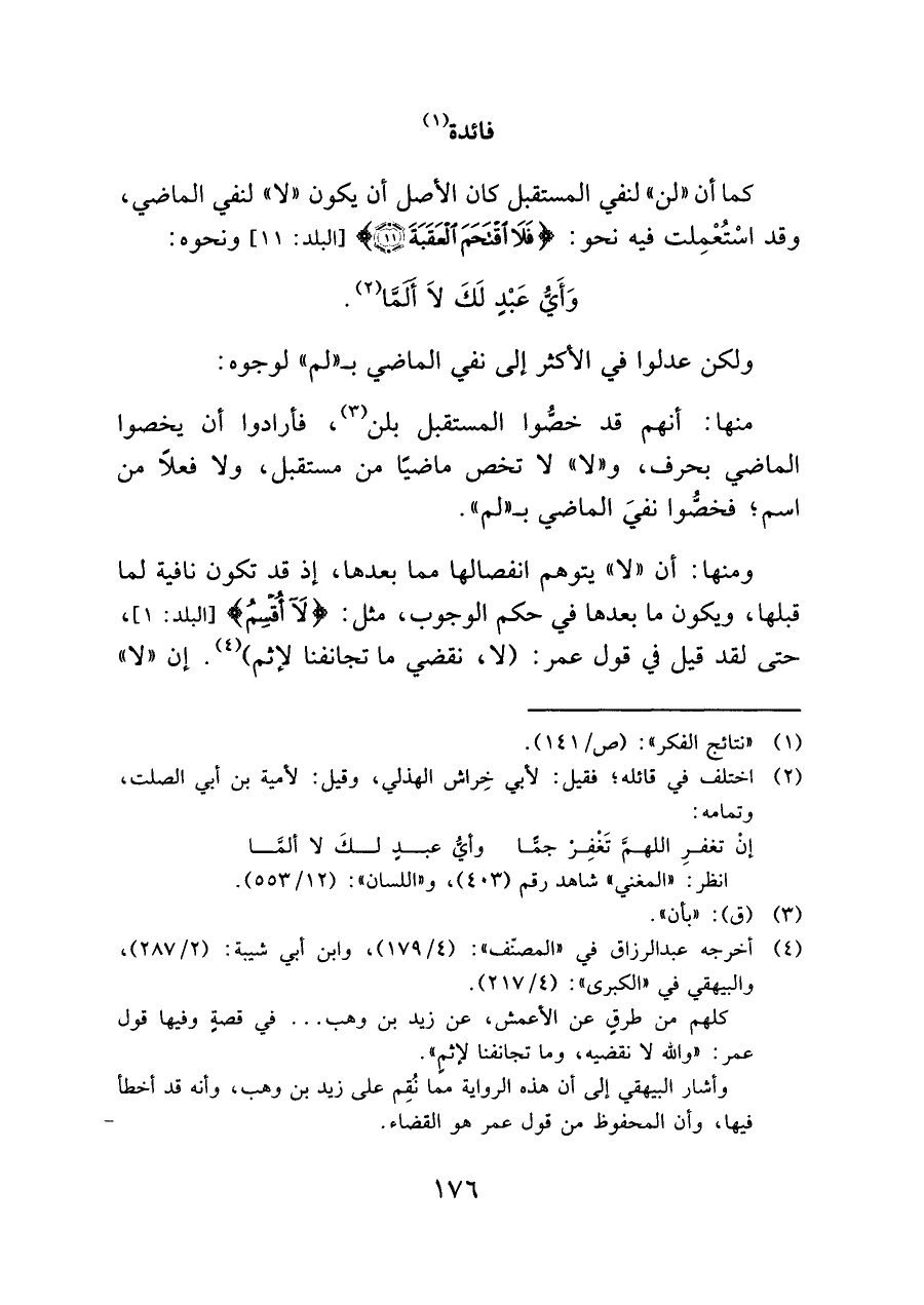 ومنها: أن "لا" يتوهم انفصالها مما بعدها، إذ قد تكون نافية لما قبلها، ويكون ما بعدها في حكم الوجوب، مثل: {لَا أُقْسِمُ} [البلد: ١]، حتى لقد قيل في قول عمر: (لا، نقضي ما تجانفنا لإثم) (¬٤). إن "لا":
