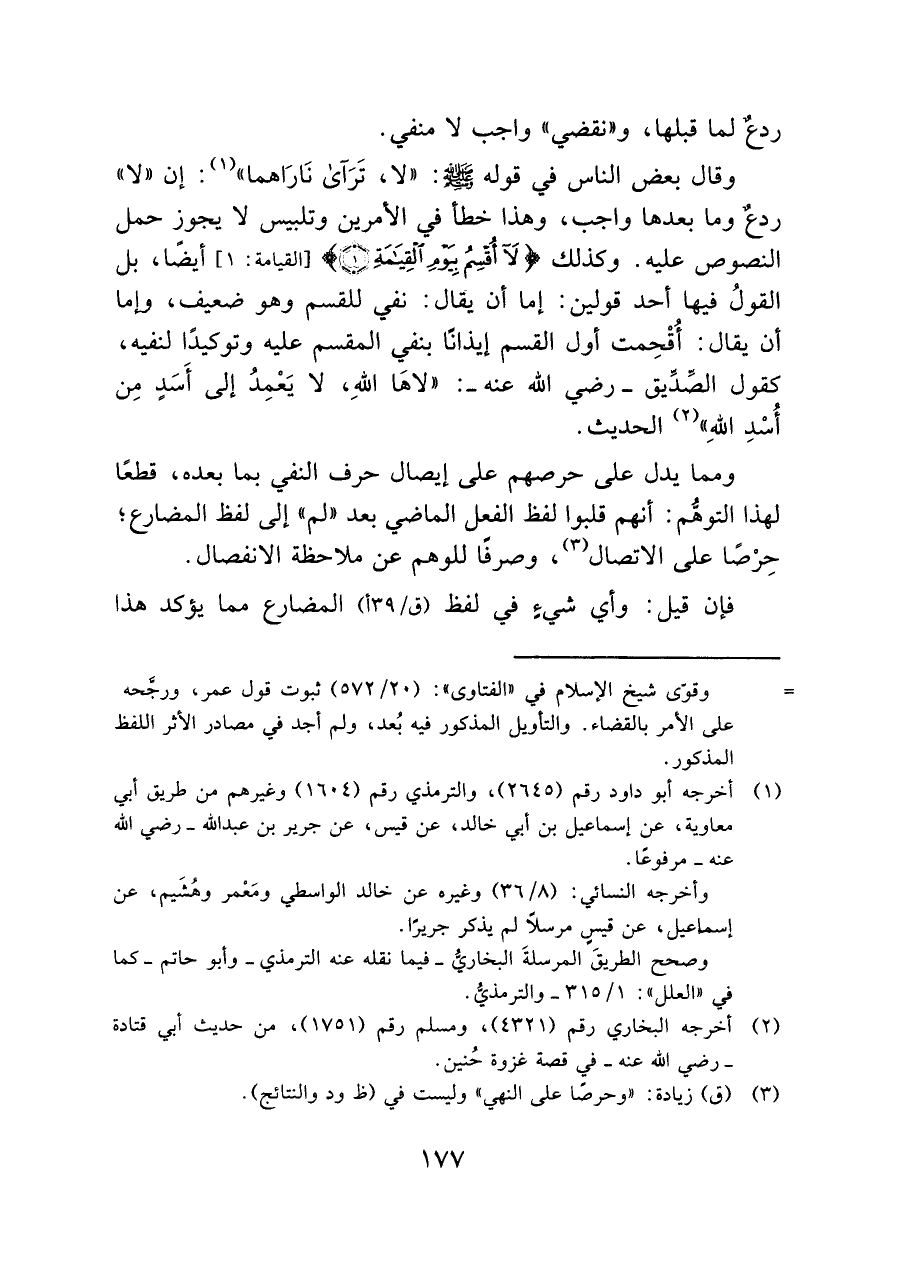 وقال بعض الناس في قوله - صلى الله عليه وسلم -: "لا، تَرَآي نَارَاهما" (¬١): إن "لا" ردعٌ وما بعدها واجب، وهذا خطأ في الأمرين وتلبيس لا يجور حمل النصوص عليه. وكذلك {لَا أُقْسِمُ بِيَوْمِ الْقِيَامَةِ (١)} [القيامة: ١] أيضًا، بل القولُ فيها أحد قولين: إما أن يقال: نفي للقسم وهو ضعيف، وإما أن يقال: أُقْحِمت أول القسم إيذانًا بنفي المقسم عليه وتوكيدًا لنفيه، كقول الصِّدِّيق -رضي الله عنه-: "لاهَا اللهِ، لا يَعْمِدُ إلى أَسَدٍ مِن أُسْدِ اللهِ" (¬٢) الحديث.