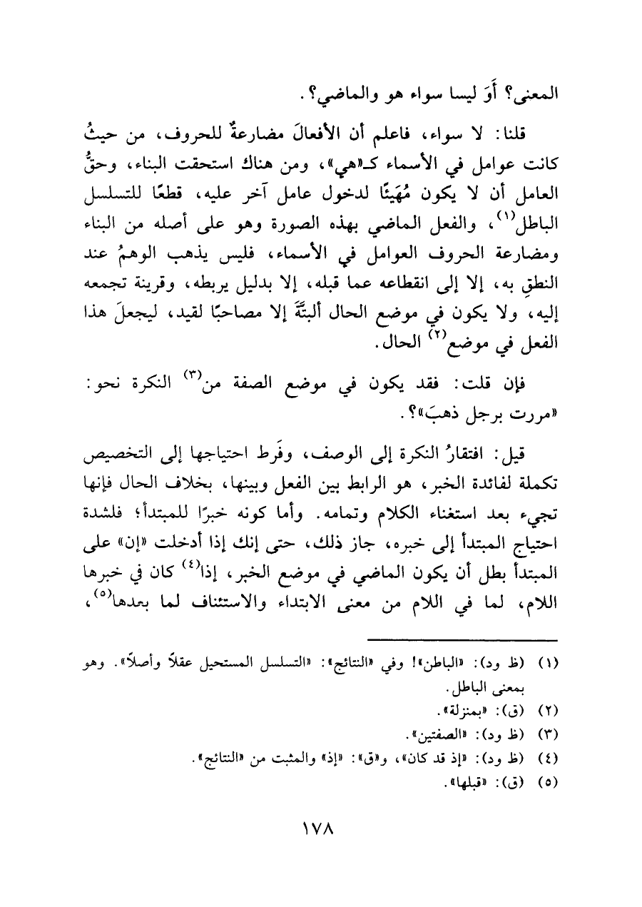 قلنا: لا سواء، فاعلم أن الأفعالَ مضارعة للحروف، من حيثُ كانت عوامل في الأسماء كـ "هي"، ومن هناك استحقت البناء, وحقُّ العامل أن لا يكون مُهَيئًا لدخول عامل آخر عليه، قطعًا للتسلسل الباطل (¬١)، والفعل الماضي بهذه الصورة وهو على أصله من البناء ومضارعة الحروف العوامل في الأسماء، فليس يذهب الوهمُ عند النطقِ به، إلا إلى انقطاعه عما قبله، إلا بدليل يربطه، وقرينة تجمعه إليه، ولا يكون في موضع الحال ألبتَّةَ إلا مصاحبًا لقيد، ليجعلَ هذا الفعل فى موضع (¬٢) الحال.