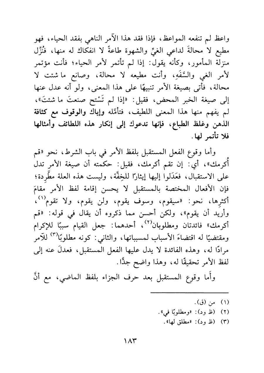 واعظ لم تنفعه المواعظ، فإذا فقد هذا الآمر الناهى بفقد الحياء، فهو مطيع لا محالةَ لداعى الغيِّ والشهوة طاعةً لا انفكاك له منها، فنُزِّل منزلة المأمور، وكأنه يقول: إذا لم تأتمر لأمر الحياء؛ فأنت مؤتمر لأمر الغي والسَّفَهِ، وأنت مطيعه لا محالة، وصانع ما شئت لا محالة، فأتى بصيغة الأمر تنبيهًا على هذا المعنى، ولو أنه عدل عنها إلى صيغة الخبر المحض، فقيل: "إذا لم تَسْتح صنعتَ ما شئتَ"، لم يفهم منها هذا المعنى اللطيف، فتأمَّله وإياك والوقوف مع كثافة الذهن وغلظ الطباع، فإنها تدعوك إلى إنكار هذه اللطائف وأمثالها فلا تأتمر لها.