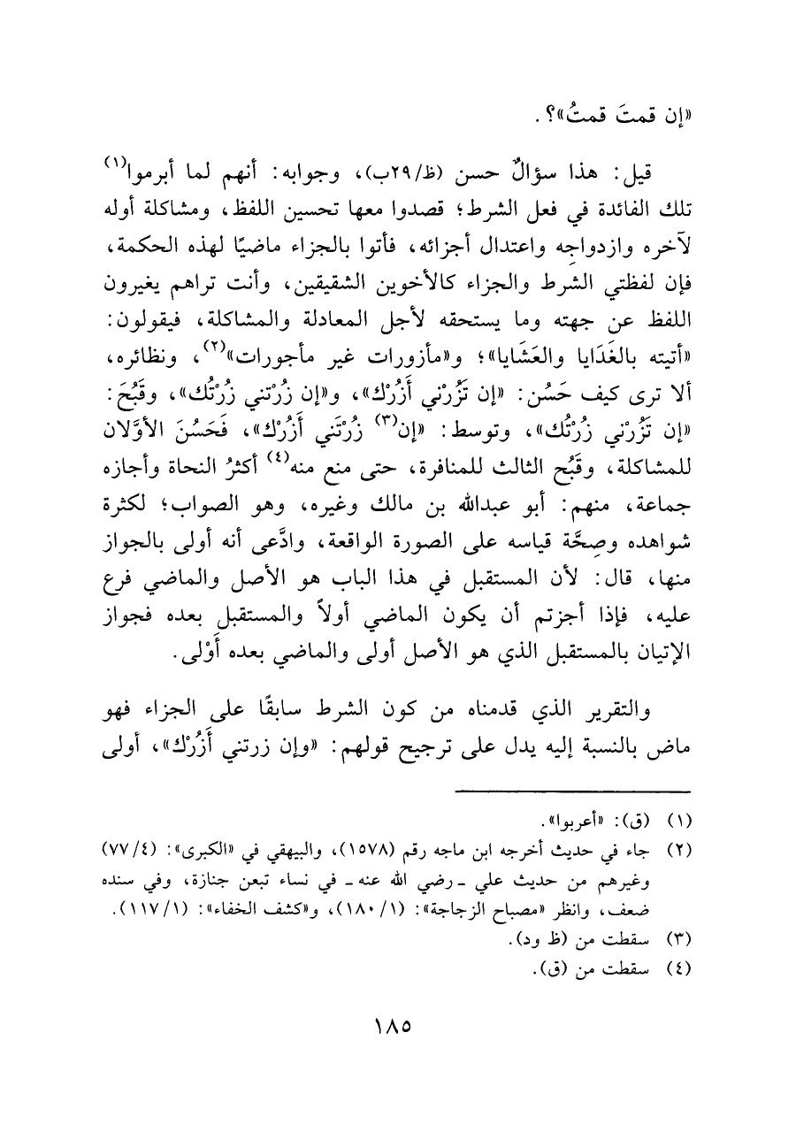قيل: هذا سؤالٌ حسن (ظ/٢٩ ب)، وجوابه: أنهم لما أبرموا (¬١) تلك الفائدة في فعل الشرط؛ قصدوا معها تحسين اللفظ، ومشاكلة أوله لآخره وازدواجِه واعتدال أجزائه، فأتوا بالجزاء ماضيًا لهذه الحكمة، فإن لفظتي الشَّرط والجزاء كالأخوين الشقيقين، وأنت تراهم يغيرون اللفظ عن جهته وما يستحقه لأجل المعادلة والمشاكلة، فيقولون: "أتيته بالغَدَايا والعَشَايا"؛ و"مأزورات غير مأجورات" (¬٢)، ونظائره، ألا ترى كيف حَسُن: "إن تَزُرْني أَزُرْك"، و"إن زُرْتني زُرْتُك"، وقَبُحَ: "إن تَزُرْني زُرْتُك"، وتوسط: "إن (¬٣) زُرتَني أَزُرْك"، فَحَسُنَ الأوَّلان للمشاكلة، وقَبُح الثالث للمنافرة، حتى منع منه (¬٤) أكثرُ النحاة وأجازه جماعة، منهم: أبو عبد الله بن مالك وغيره, وهو الصواب، لكثرة شواهده وصِحَّة قياسه على الصورة الواقعة، وادَّعى أنه أولى بالجواز منها، قال: لأن المستقبل في هذا الباب هو الأصل والماضي فرع عليه، فإذا أجزتم أن يكون الماضي أولًا والمستقبل بعده فجواز الإتيان بالمستقبل الذي هو الأصل أولى والماضي بعده أَوْلى.