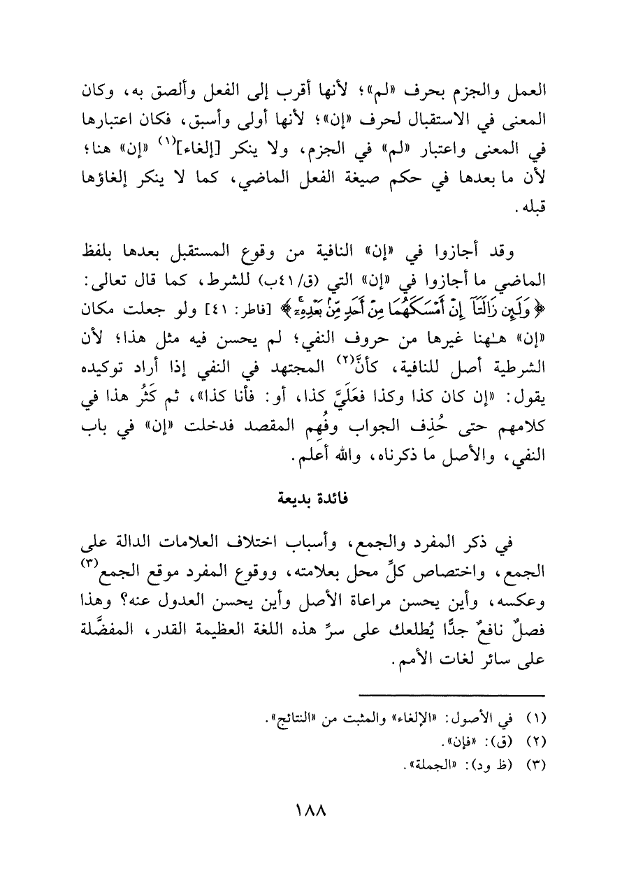 وقد أجازوا في "إن" النافية من وقوع المستقبل بعدها بلفظ الماضي ما أجازوا في "إن" التي (ق/ ٤١ ب) للشرط، كما قال تعالى: {وَلَئِنْ زَالَتَا إِنْ أَمْسَكَهُمَا مِنْ أَحَدٍ مِنْ بَعْدِهِ} [فاطر: ٤١] ولو جعلت مكان "إن" هاهنا غيرها من حروف النفي؛ لم يحسن فيه مثل هذا؛ لأن الشرطية أصل للنافية, كأن (¬٢) المجتهد في النفي إذا أراد توكيده يقول: "إن كان كذا وكذا فعَلَيَّ كذا، أو: فأنا كذا"، ثم كَثُر هذا في كلامهم حتى حُذِف الجواب وفُهِم المقصد فدخلت "إن" في باب النفي، والأصل ما ذكرناه، والله أعلم.