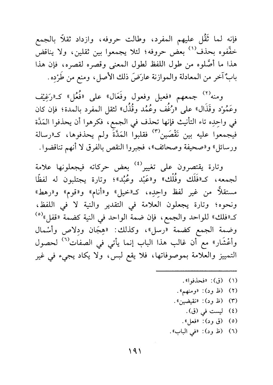 وتارة يقتصرون على تغيير (¬٤) بعض حركاته فيجعلونها علامة لجمعه، كـ "فَلَك وفُلْك" و"عَبْد وعُبُد", وتارة يجتلبون له لفظًا مستقلًّا من غير لفظ واحِدِه، كـ "خيل" و"أنام" و"قوم" و"رهط" ونحوه؛ وتارة يجعلون العلامة في التقدير والنية لا في اللفظ، كـ "فلك" للواحد والجمع، فإن ضمة الواحد في النية كضمة "قفل" (¬٥) وضمة الجمع كضمة "رسل"؛ وكذلك: "هِجَان ودِلاصى وأسْمال وأعْشَار" مع أن غالب هذا الباب إنما يأتي في الصفات (¬٦) لحصول التمييز والعلامة بموصوفاتها، فلا يقع ليس، ولا يكاد يجيء في غير
