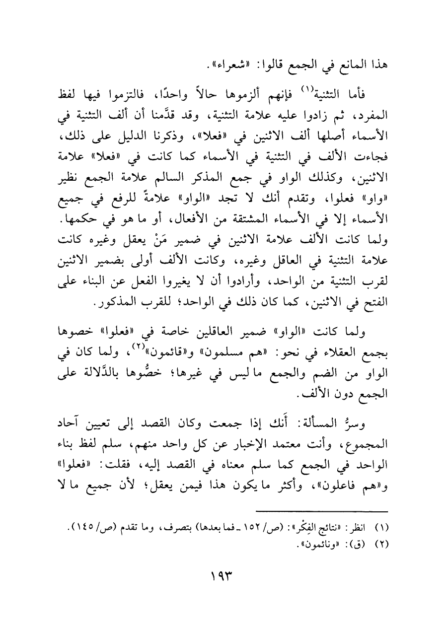 وسرُّ المسألة؛ أَنك إذا جمعت وكان القصد إلى تعيين آحاد المجموع، وأنت معتمد الإخبار عن كل واحد منهم، سلم لفظ باء الواحد في الجمع كما سلم معناه في القصد إليه، فقلت: "فعلوا" و"هم فاعلون"، وأكثر ما يكون هذا فيمن يعقل؛ لأن جميع ما لا