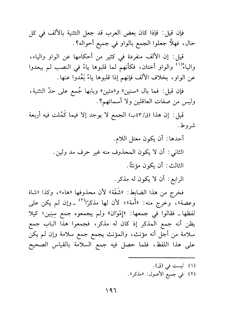 فخرج من هذا الضابط: "شَفَة" لأن محذوفها "هاء"، وكذا "شاة وعضة"، وخرج منه: "أَمة"؛ لأن لها مذكرًا (¬٢) -وإن لم يكن على لفظها- فقالوا: في جمعها: "إِمْوَان" ولم يجمعوه جمع سِنِين؛ كيلا يظن أنه جمع المذكر إذ كان له مذكر، فجمعوا هذا الباب جمع سلامة من أجل أنه مؤنث، والمؤنث يجمع جمع سلامة وإن لم يكن على هذا اللفظ، فلما حصل فيه جمع السلامة بالقياس الصحيح