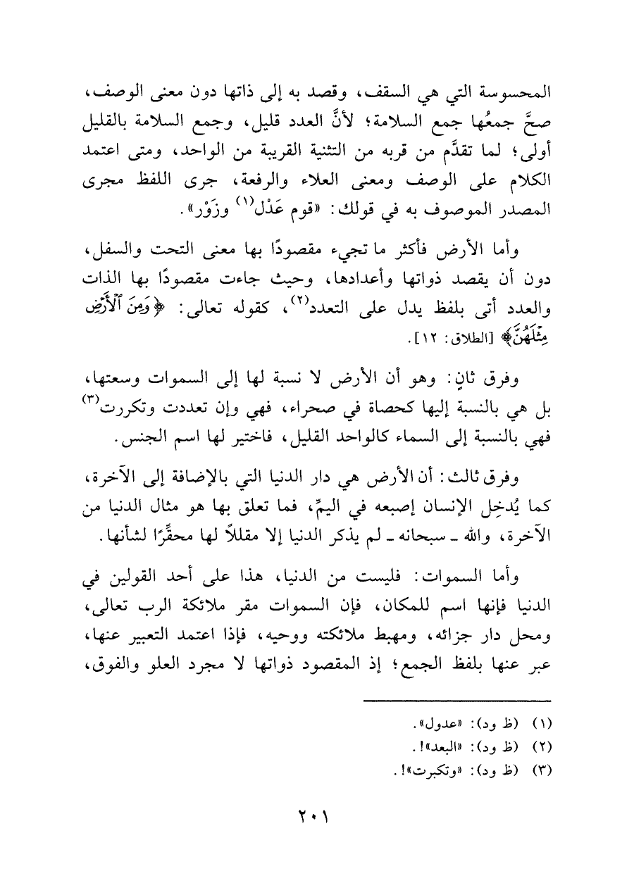 وأما الأرض فأكثر ما تجيء مقصودًا بها معنى التحت والسفل، دون أن يقصد ذواتها وأعدادها، وحيث جاءت مقصودًا بها الذات والعدد أتي بلفظ يدل على التعدد (¬٢)، كقوله تعالى: {وَمِنَ الْأَرْضِ مِثْلَهُنَّ} [الطلاق: ١٢].