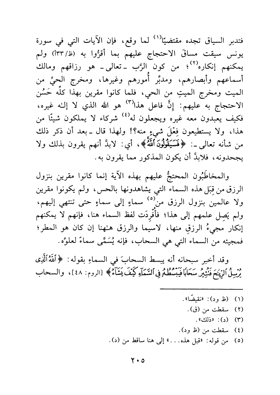 فتدبر السياق تجده مقتضيًا (¬١) لما وقع، فإن الآيات التي في سورة يونس سيقت مساقَ الاحتجاج عليهم بما أقرُّوا به (ظ/١٣٣ أ) ولم يمكنهم إنكار (¬٢)؛ من كون الرَّب -تعالى- هو رازقهم ومالك أسماعهم وأبصارهم، ومدبِّر أُمورهم وغيرها، ومخرج الحيِّ من الميت ومخرج الميتِ من الحي، فلما كانوا مقرين بهذا كلِّه حَسُن الاحتجاج به عليهم: إِنَّ فاعل هذا (¬٣) هو الله الذي لا إله غيره، فكيف يعبدون معه غيره ويجعلون له (¬٤) شركاء لا يملكون شيئًا من هذا، ولا يستطيعون فِعْلَ شيءٍ منه؟! ولهذا قال -بعد أن ذكر ذلك من شأنه تعالى-: {فَسَيَقُولُونَ اللَّهُ}، أي: لابدَّ أنهم يقرون بذلك ولا يجحدونه، فلابدَّ أن يكون المذكور مما يقرون به.