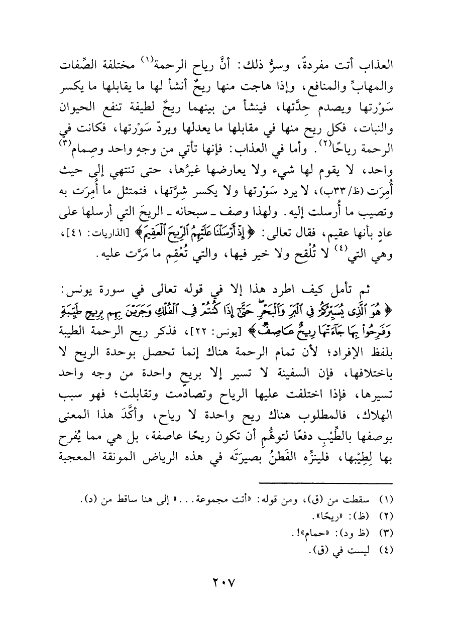 ثم تأمل كيف اطرد هذا إلا قي قوله تعالى في سورة يونس: {هُوَ الَّذِي يُسَيِّرُكُمْ فِي الْبَرِّ وَالْبَحْرِ حَتَّى إِذَا كُنْتُمْ فِي الْفُلْكِ وَجَرَيْنَ بِهِمْ بِرِيحٍ طَيِّبَةٍ وَفَرِحُوا بِهَا جَاءَتْهَا رِيحٌ عَاصِفٌ} [يونس: ٢٢] فذكر ريح الرحمة الطيبة بلفظ الإفراد؛ لأن تمام الرحمة هناك إنما تحصل بوحدة الريح لا باختلافها، فإن السفينة لا تسير إلا يريحٍ واحدة من وجه واحد تسيرها، فإذا اختلفت عليها الرياح وتصادمت وتقابلت؛ فهو سبب الهلاك، فالمطلوب هناك ريح واحدة لا رياح، وأكَّدَ هذا المعنى بوصفها بالطِّيْب دفعًا لتوهُّمِ أن تكون ريحًا عاصفة، بل هي مما يُفرح بها لِطِيْبها، فلَينزِّه الفَطنُ بصيرَتَه في هذه الرياض المونقة المعجبة