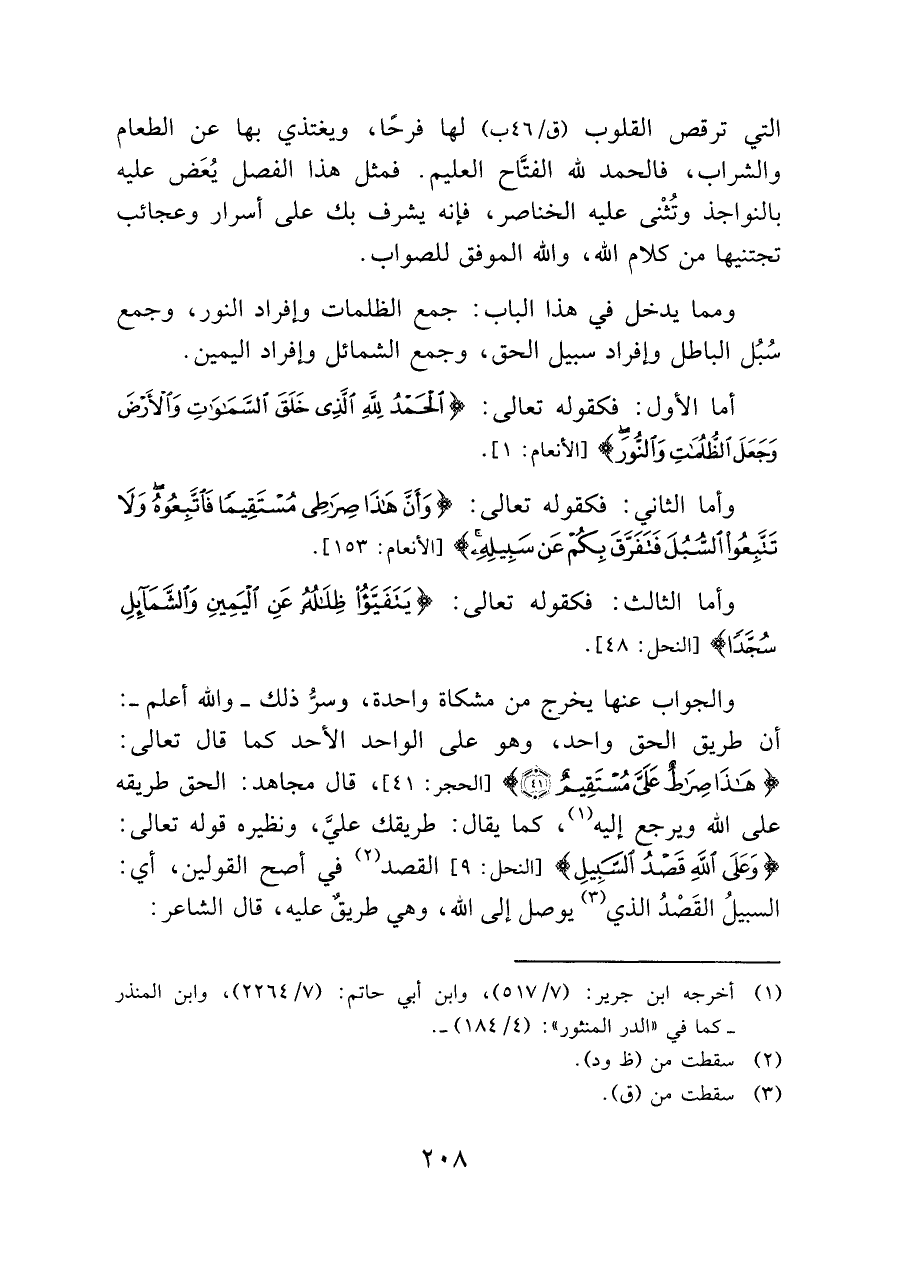 ومما يدخل في هذا الباب: جمع الظلمات وإفراد النور، وجمع سُبُل الباطل وإفراد سبيل الحقّ، وجمع الشمائل وإفراد اليمين.