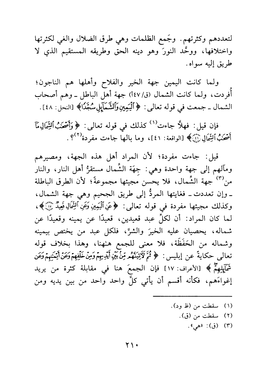 ولما كانت اليمين جهة الخير والفلاح وأهلها هم الناجون؛ أُفردت، ولما كانت الشمال (ق/ ٤٧ أ) جهة أهل الباطل -وهم أصحاب الشمال- جمعت في قوله تعالى: {الْيَمِينِ وَالشَّمَائِلِ سُجَّدًا} [النحل: ٤٨].