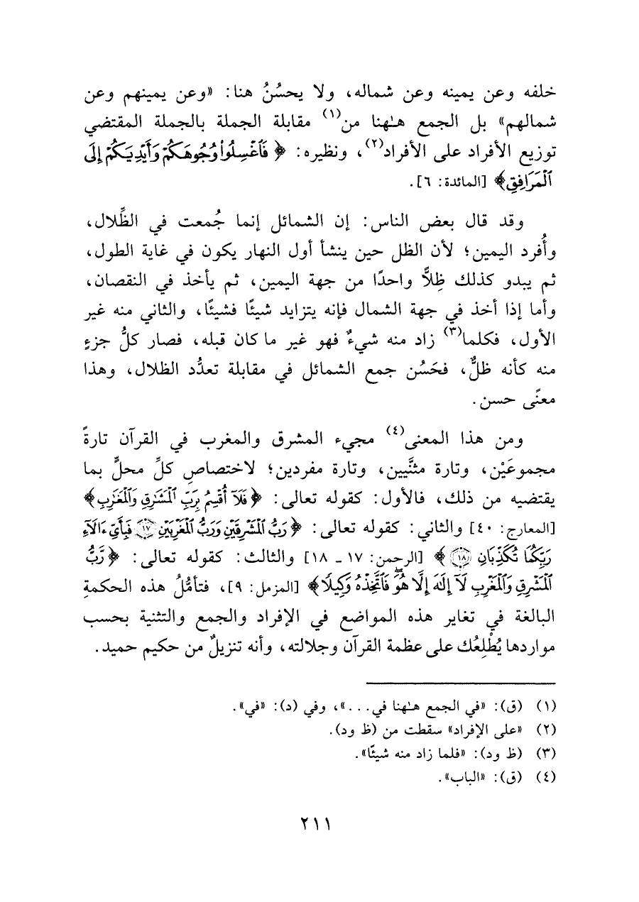 ومن هذا المعنى (¬٤) مجيء المشرق والمغرب في القرآن تارةً مجموعَيْن، وتارة منثنَّيين، وتارة مفردين؛ لاختصاصِ كلِّ محلٍّ بما يقتضيه من ذلك، فالأول: كقوله تعالى: {فَلَا أُقْسِمُ بِرَبِّ الْمَشَارِقِ وَالْمَغَارِبِ} [المعارج: ٤٠] والثاني: كقوله تعالى: {رَبُّ الْمَشْرِقَيْنِ وَرَبُّ الْمَغْرِبَيْنِ (١٧) فَبِأَيِّ آلَاءِ رَبِّكُمَا تُكَذِّبَانِ (١٨)} [الرحمن: ١٧ - ١٨] والثالث: كقوله تعالى: {رَبُّ الْمَشْرِقِ وَالْمَغْرِبِ لَا إِلَهَ إِلَّا هُوَ فَاتَّخِذْهُ وَكِيلًا (٩)} [المزمل: ٩]، فتأمّلُ هده الحكمةِ البالغة في تغاير هده المواضع في الإفراد والجمع والتثنية بحسب مواردها يُطْلِعُك على عظمة القرآن وجلالته، وأنه تنزيلٌ من حكيم حميد.