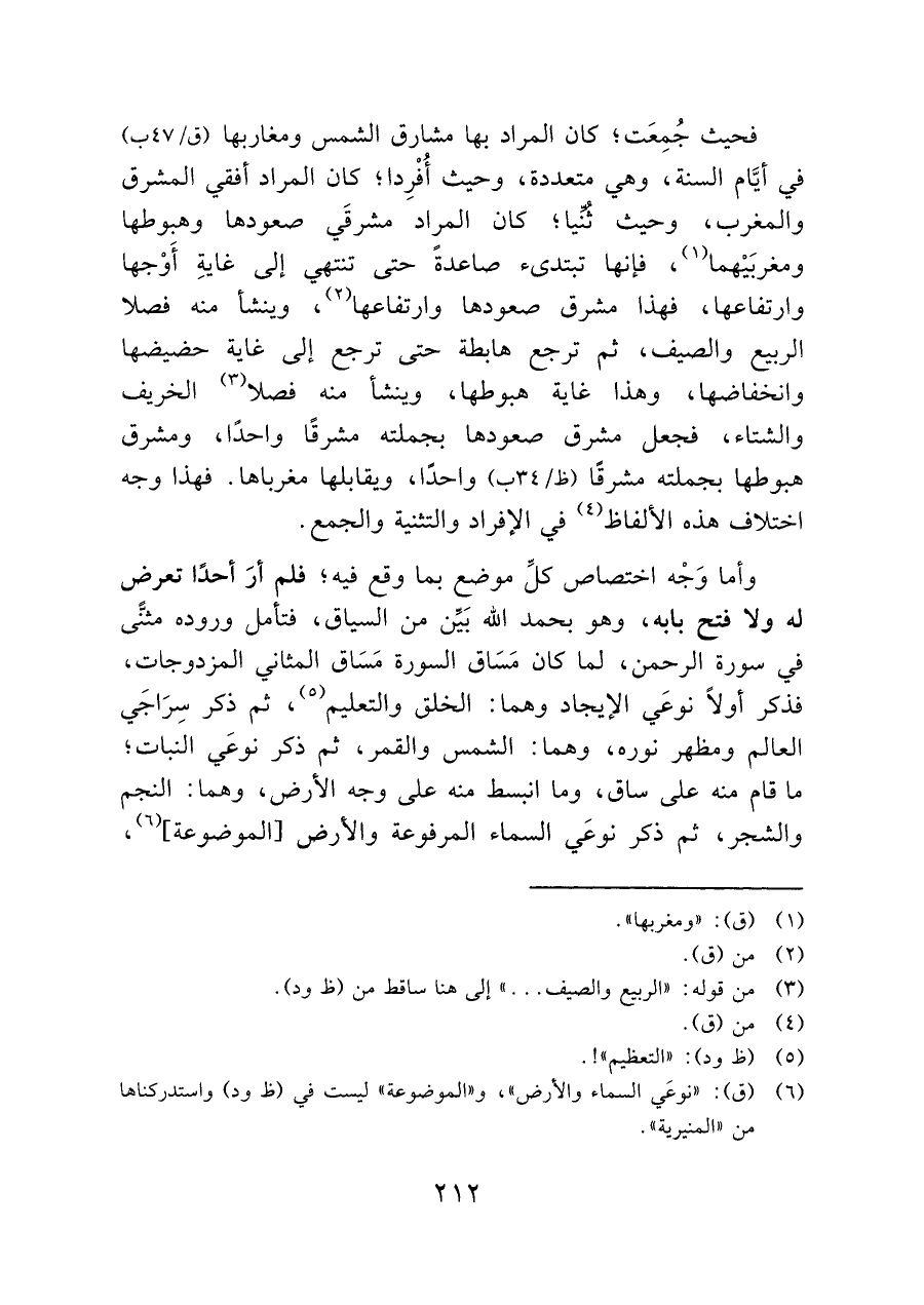 فحيث جُمِعَت؛ كان المراد بها مشارق الشمس ومغاربها (ق/٤٧ ب) في أيَّام السنة، وهي متعددة، وحيث أُفْرِدا؛ كان المراد أفقي المشرق والمغرب، وحيث ثُنيا؛ كان المراد مشرقَي صعودها وهبوطها ومغربَيْهما (¬١)، فإنها تبتدئ صاعدةً حتى تنتهي إلى غايةِ أَوْجها وارتفاعها، فهذا مشرق صعودها وارتفاعها (¬٢)، وينشأ منه فصلا الربيع والصيف، ثم: ترجع هابطة حتى ترجع إلى غاية خضيضها وانخفاضها، وهذا غاية هبوطها، وينشأ منه فصلا (¬٣) الخريف والشتاء، فجعل مشرق صعودها بجملته مشرقًا واحدًا، ومشرق هبوطها بجملته مشرقًا (ظ/ ٣٤ ب) واحدًا، ويقابلها مغرباها. فهذا وجه اختلاف هذه الألفاظ (¬٤) في الإفراد والتثنية والجمع.