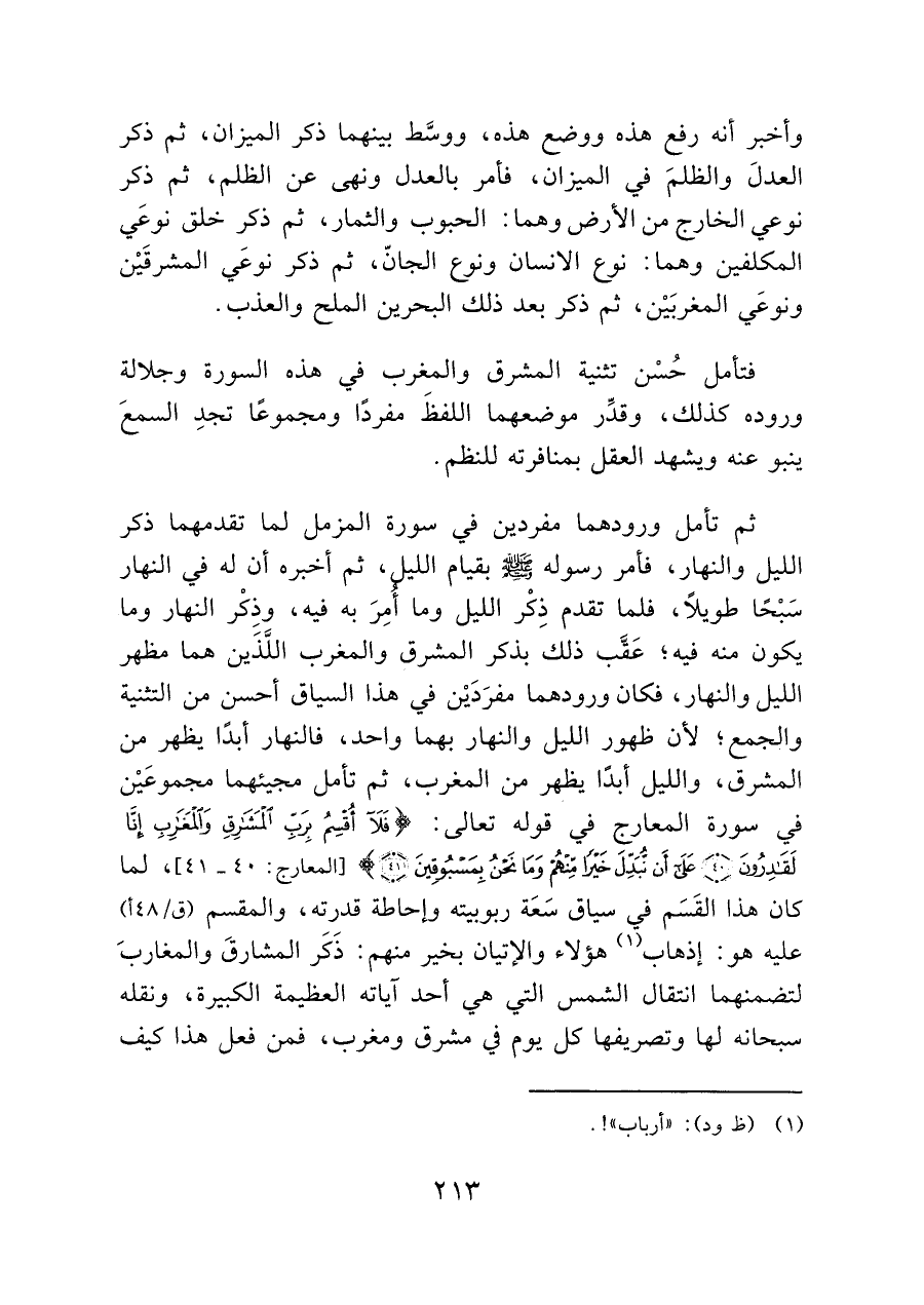 فتأمل حُسْن تثنية المشرق والمغرب في هذه السورة وجلالة وروده كذلك، وقدِّر موضعهما اللفظَ مفردًا ومجموعًا تجدِ السمعَ ينبو عنه ويشهد العقل بمنافرته للنظم.