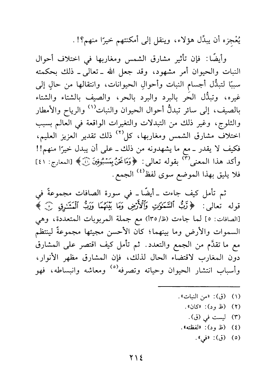 وأيضًا: فإن تأثير مشارق الشمس ومغاربها في اختلاف أحوال النبات والحيوان أمر فشهود، وقد جعل الله -تعالى- ذلك بحكمته سببًا لتبذُّل أجسام النبات وأحوالِ الحيوانات، وانتقالها من حالٍ إلى غيره، وتبدُّل الحَر بالبرد والبرد بالحر، والصيف بالشتاء والشتاء بالصيف، إلى سائر تبدلُّ أحوال الحيوان والنيات (¬١) والرياح والأمطار والثلوج، وغير ذلك من التبدلات والتغيرات الواقعة في العالم بسبب اختلاف مشارق الشمس ومغاربها، كل (¬٢) ذلك تقدير العزيز العليم، فكيف لا يقدر -مع ما يشهدونه من ذلك- على أن يبدل خيرًا منهم!! وأكد هذا المعنى (¬٣) بقوله تعالى: {وَمَا نَحْنُ بِمَسْبُوقِينَ (٤١)} [المعارج: ٤١]. فلا يليق بهذا الموضع: سوى لفظ (¬٤) الجمع.