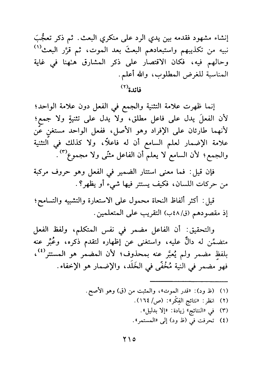 والتحقيق: أن الفاعل مضمر في نفس المتكلم، ولفظ الفعل متضمِّن له دالٌّ عليه، واستغنى عن إظهاره لتقدم ذكره، وعُبَّر عنه بلفظٍ مضمر ولم يُعبَّر عنه بمحذوف؛ لأن المضمر هو المستتر (¬٤)، فهو مضمر في النية مُخْفًى في الخَلَد، والإضمار هو الإخفاء.
